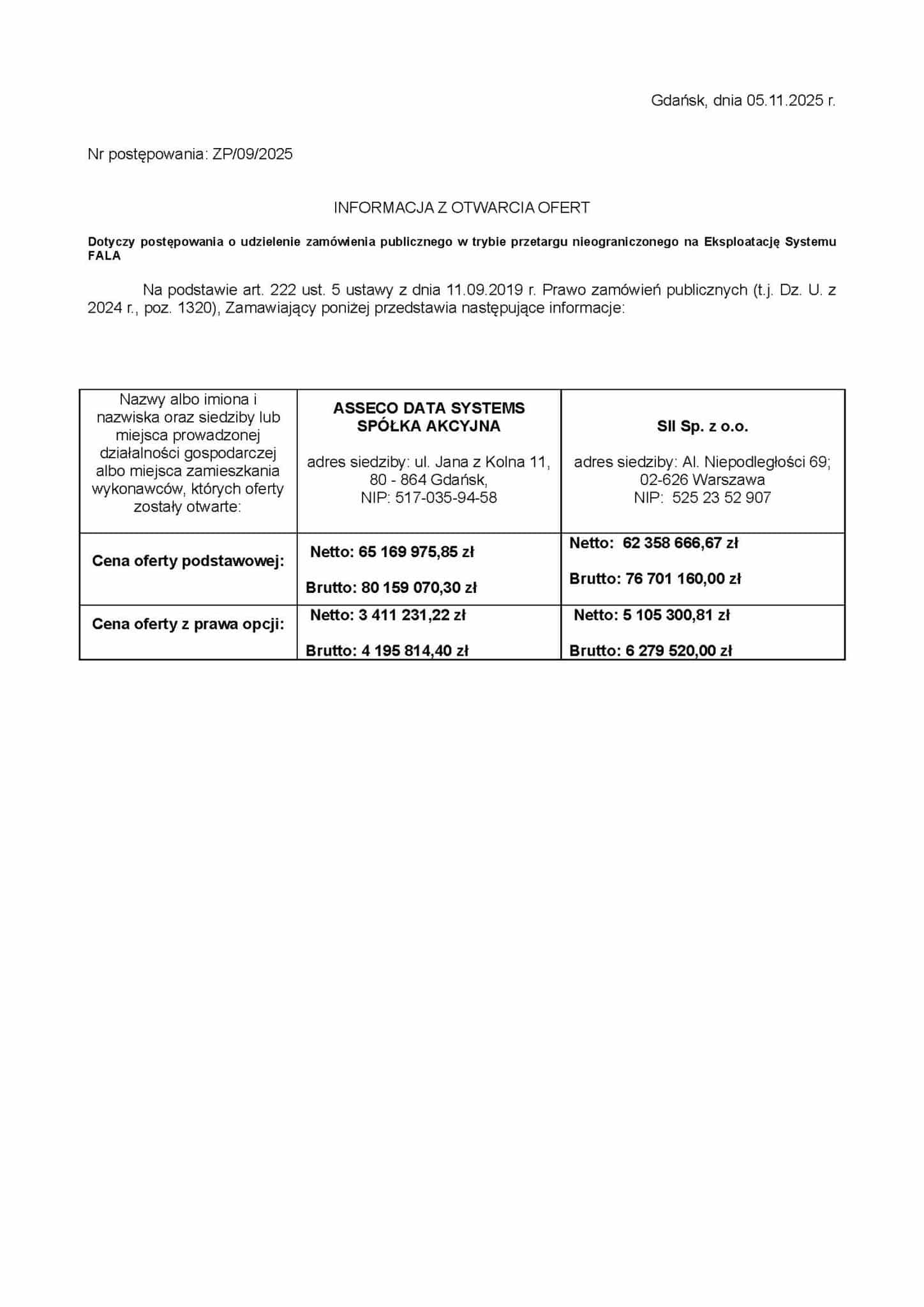 Oferta obejmuje część podstawową oraz opcję w wysokości 4.195.814,40 PLN brutto (3.411.231,22 PLN netto). - SII Sp. z o.o. (Warszawa) – 76.701.160,00 PLN brutto (62.358.666,67 PLN netto)