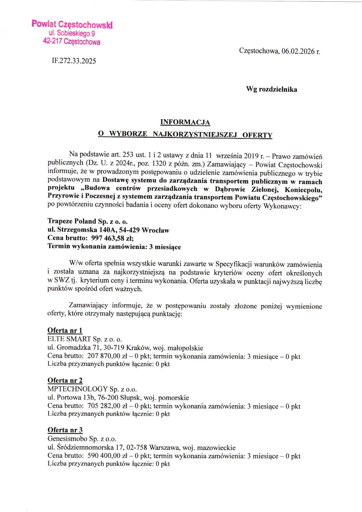5 marca 2026 roku Powiat Częstochowski podpisał umowę na wdrożenie systemu zarządzania transportem publicznym w ramach projektu budowy centrów przesiadkowych.