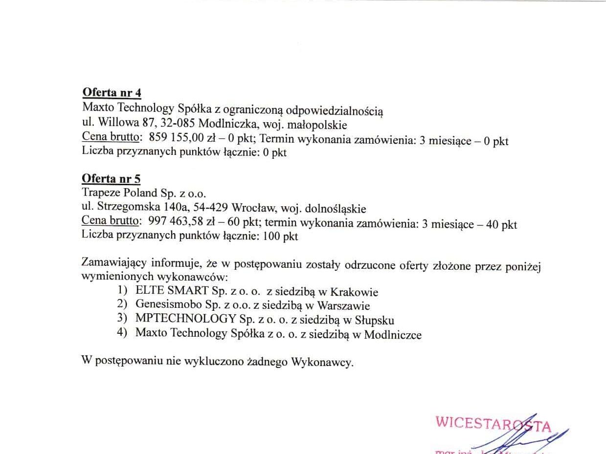Trzy pozostałe oferty zostały odrzucone. W przypadku ELTE Smart, MPTechnology oraz Genesismobo zamawiający uznał, że zaproponowane ceny są rażąco niskie, a część wykonawców nie wyraziła zgody na przedłużenie terminu związania ofertą.