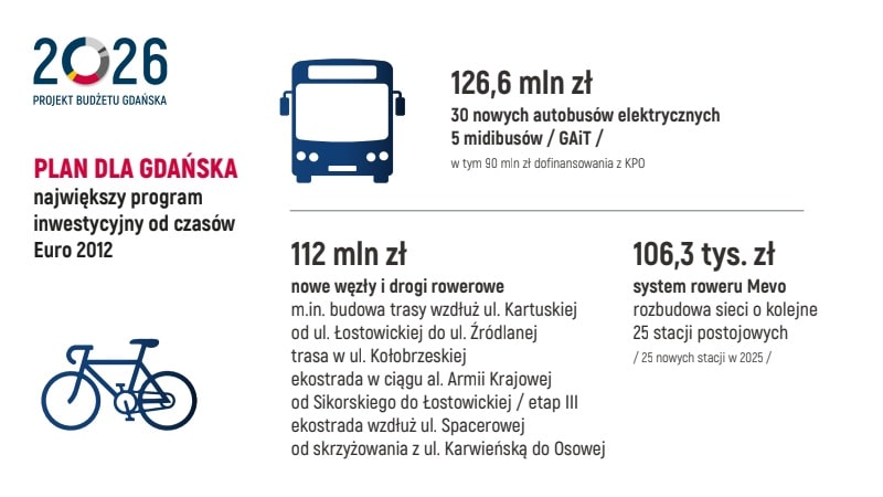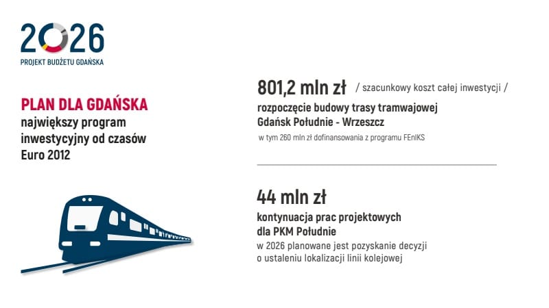 Najważniejszą inwestycją transportową ma być rozpoczęcie budowy trasy tramwajowej pomiędzy Gdańskiem Południe a Wrzeszczem. Całkowity koszt tego projektu oszacowano na ponad 801 mln zł, a 260 mln zł ma stanowić unijne dofinansowanie z programu FEnIKS. Z perspektywy pasażera to projekt o dużym znaczeniu: ma poprawić dostępność kluczowego węzła w Wrzeszczu i skrócić czas przejazdu między południowymi dzielnicami a jednym z najważniejszych obszarów przesiadkowych i usługowych w mieście.