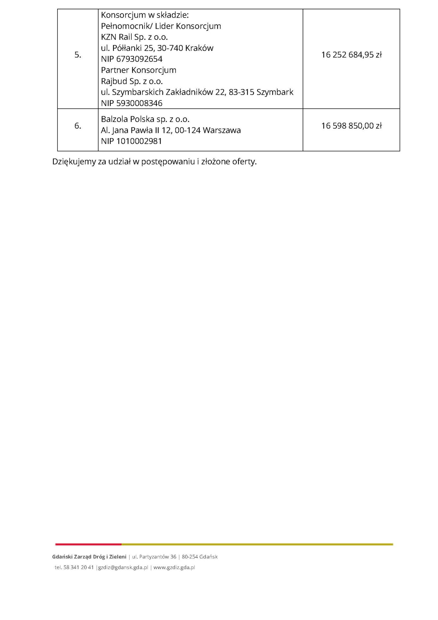 W przetargu wzięło udział sześć podmiotów. Jak wynika z Biuletynu Informacji Publicznej GZD, oprócz zwycięskiego konsorcjum ofertę złożyło konsorcjum z liderem KZN Rail (ponad 16 mln zł), a także spółki Balzola Polska (ponad 16,5 mln zł), ZUE (ponad 16,7 mln zł) i Terlan (ponad 22,6 mln zł). W postępowaniu uczestniczyła również spółka Strabag, jednak jej oferta została odrzucona, ponieważ – jak podano – „treść oferty nie odpowiada treści zamówienia”; wykonawca nie wykazał ceny dla jednej z pozycji formularza ofertowego.