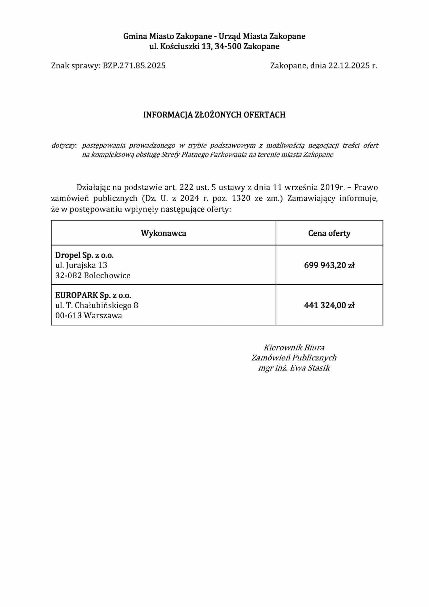 W wyznaczonym terminie do Zamawiającego wpłynęły dwie oferty. DROPel Sp. z o.o. z Bolechowic zaproponowała realizację zamówienia za 699.943,20 PLN brutto, co przy stawce VAT 23% odpowiada 569.059,51 PLN netto. Z kolei EUROPARK Sp. z o.o. z Warszawy przedstawił ofertę opiewającą na 441.324,00 PLN brutto, czyli 358.800,00 PLN netto. Różnica pomiędzy ofertami wynosi aż 258.619,20 PLN brutto, co w skali rocznego kontraktu jest wartością bardzo znaczącą dla budżetu miasta.