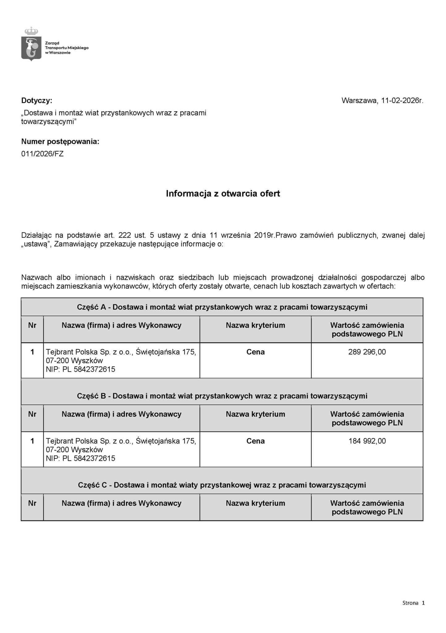 11 lutego 2026 r. Zarząd Transportu Miejskiego w Warszawie otworzył oferty w postępowaniu na dostawę i montaż sześciu wiat przystankowych.