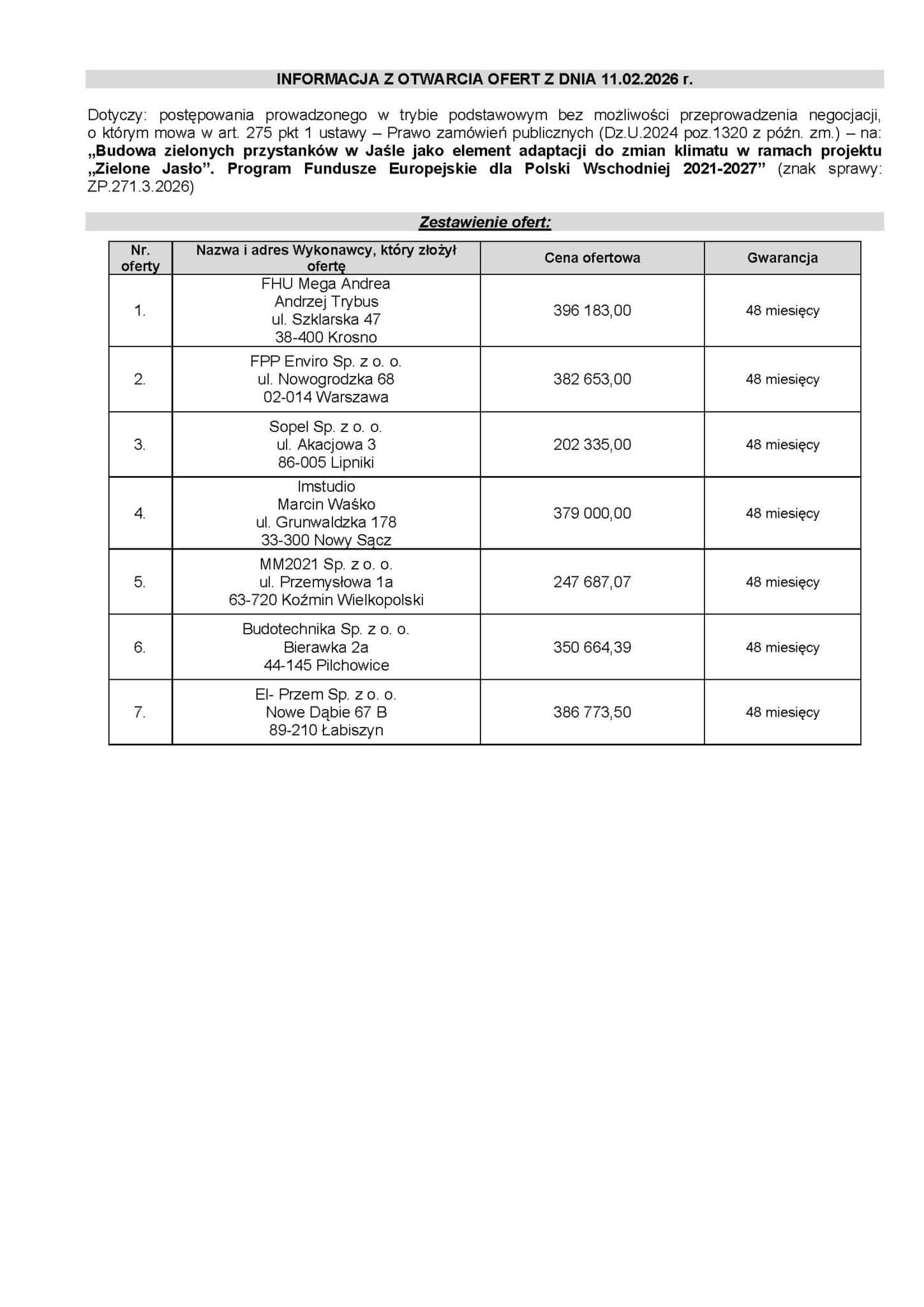 11 lutego 2026 r. Miasto Jasło otworzyło oferty w postępowaniu na „Budowę zielonych przystanków w Jaśle jako element adaptacji do zmian klimatu” w ramach projektu „Zielone Jasło”.