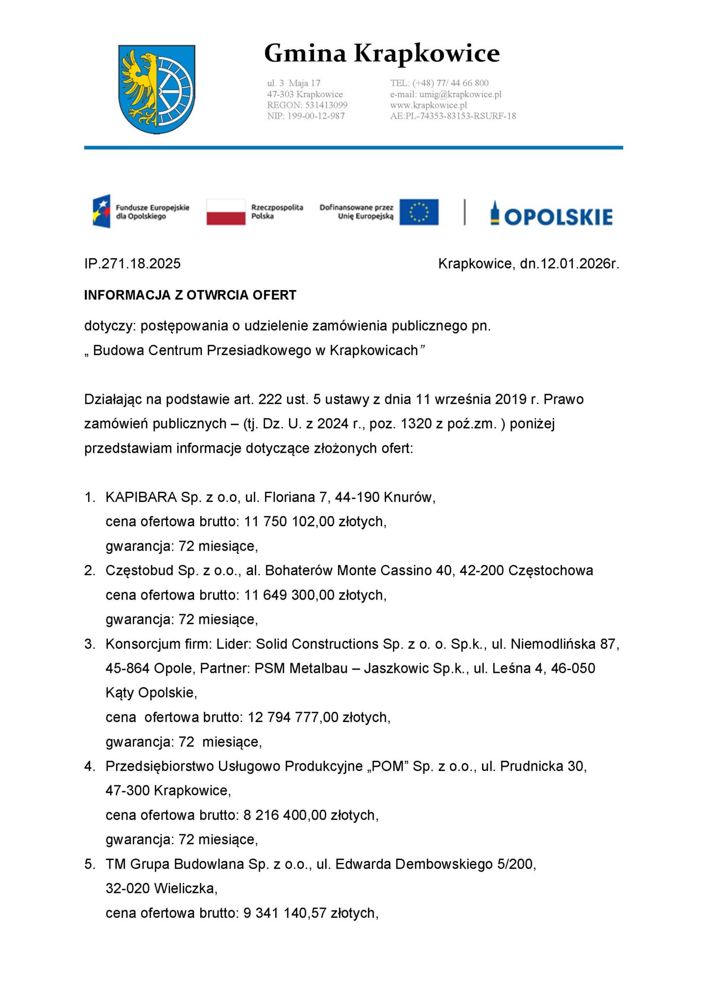 10 lutego 2026 r. Gmina Krapkowice poinformowała o wyborze najkorzystniejszej oferty w postępowaniu na realizację zadania pn. „Budowa Centrum Przesiadkowego w Krapkowicach”.