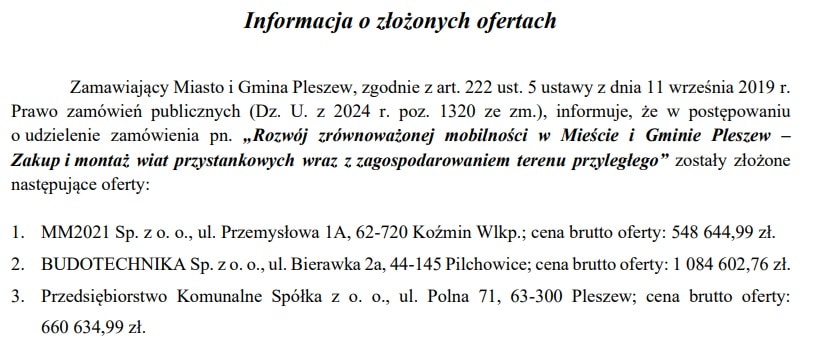 Szczegóły postępowania dostępne są pod adresem: https://transinfo.pl/infotrans/pleszew-inwestuje-w-przystanki-i-oglosil-przetarg-na-16-nowych-wiat-autobusowych/