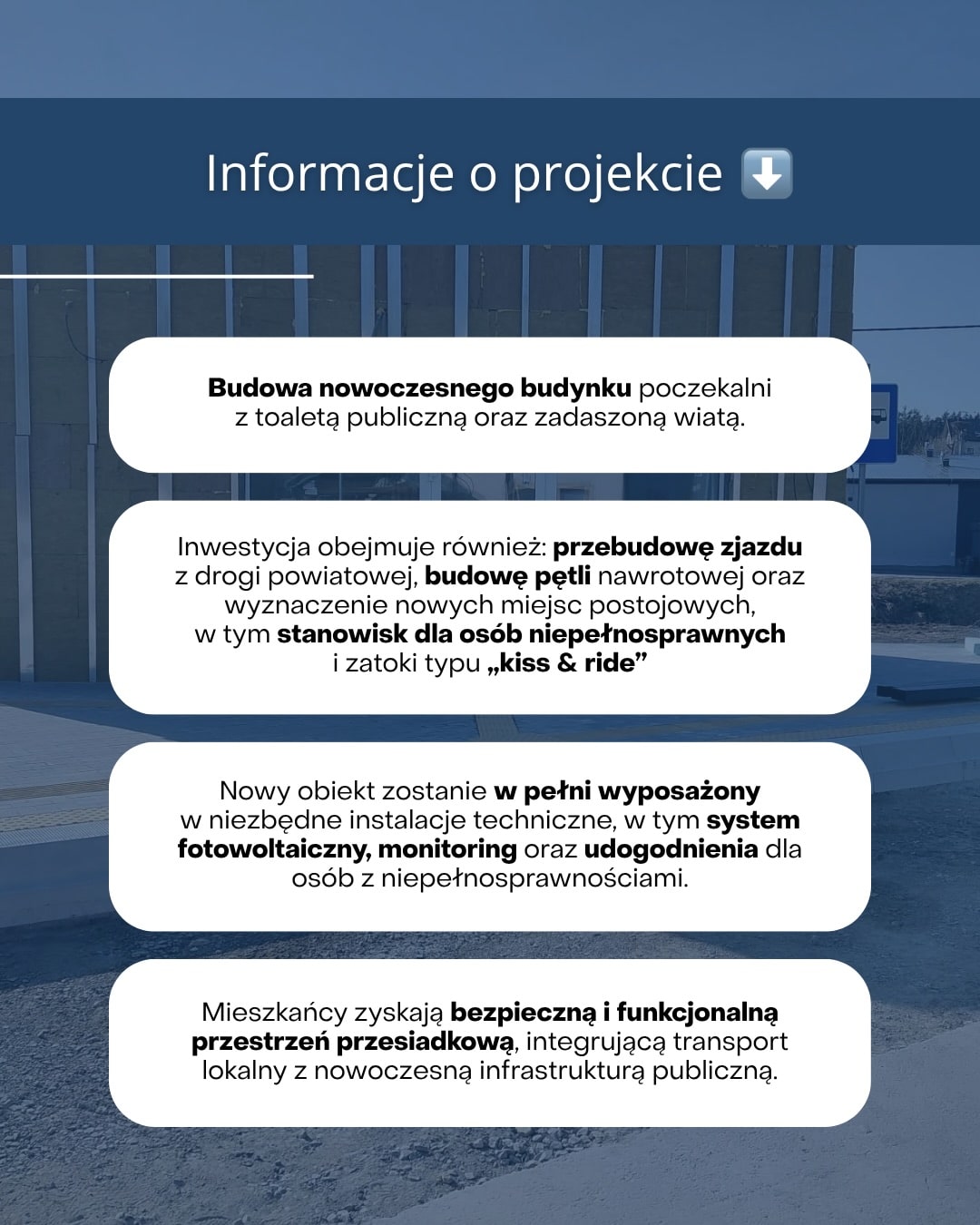 Nowa przestrzeń przesiadkowa została wyposażona w ogrzewaną zimą i klimatyzowaną latem poczekalnię, co znacząco podnosi standard oczekiwania na autobus. Dodatkowo przewidziano instalację elektronicznej tablicy informacji pasażerskiej prezentującej aktualne odjazdy. Uzupełnieniem infrastruktury są miejsca postojowe oraz zadaszona wiata rowerowa z możliwością ładowania jednośladów elektrycznych, co wpisuje się w trend integracji transportu publicznego z mikromobilnością.