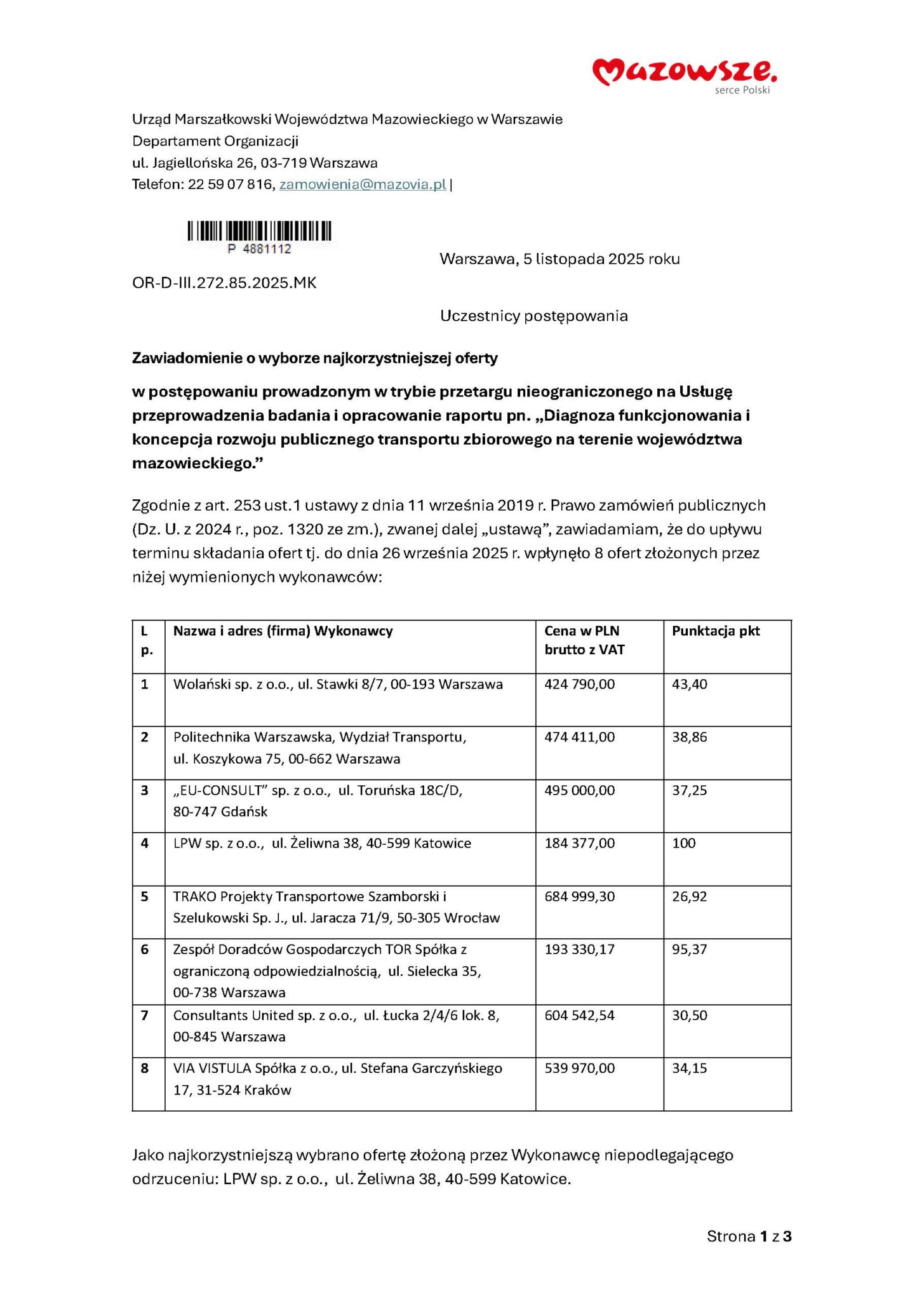 Zamawiającym w postępowaniu był Urząd Marszałkowski Województwa Mazowieckiego w Warszawie, który ogłosił przetarg nieograniczony na usługę przeprowadzenia badania i opracowania raportu pn. „Diagnoza funkcjonowania i koncepcja rozwoju publicznego transportu zbiorowego na terenie województwa mazowieckiego”. To dokument o kluczowym znaczeniu dla przyszłości transportu publicznego, obejmującego zarówno autobus, jak i kolej, a także ich wzajemną integrację.