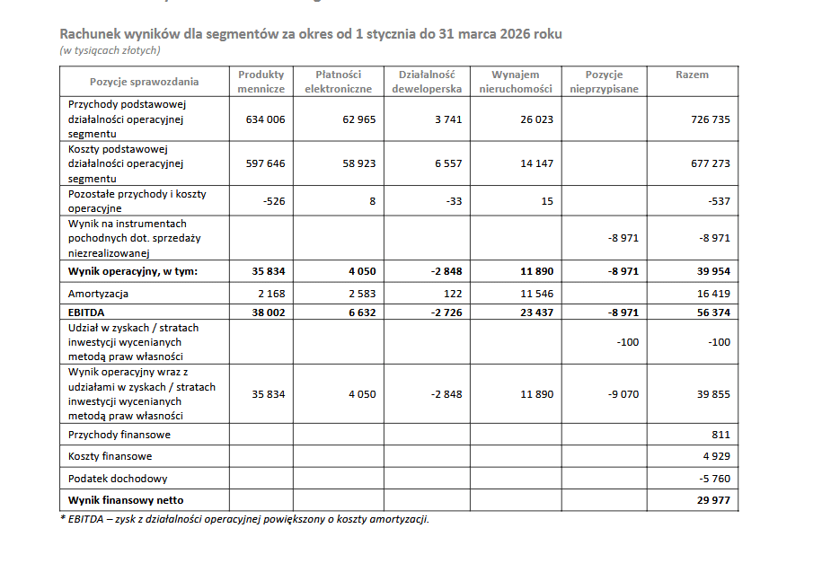 Silna pozycja finansowa Grupy wynika także z pozostałych segmentów działalności, w tym produkcji monet oraz najmu powierzchni biurowych. Segment menniczy wygenerował 634 mln zł przychodów, a sprzedaż objęła aż 651 mln sztuk monet. Równolegle rozwijany jest segment inwestycyjny – w pierwszym kwartale 2026 roku do klientów trafiło 838 kg złota, co oznacza wzrost o 38% rok do roku.