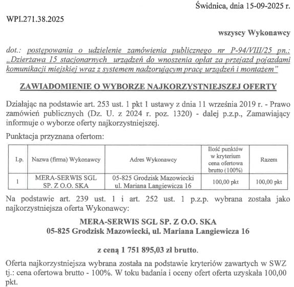 15 września 2025 r. Świdnica poinformowała o rozstrzygnięciu przetargu dotyczącego dzierżawy 15 stacjonarnych biletomatów.