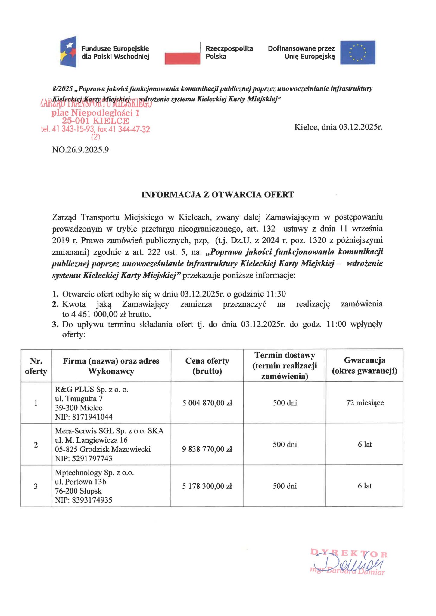 Do ZTM wpłynęły trzy oferty: R&G PLUS, Mera-Serwis SGL oraz Mptechnology. Wszystkie zostały otwarte 3 grudnia 2025 r. o godzinie 11:30: