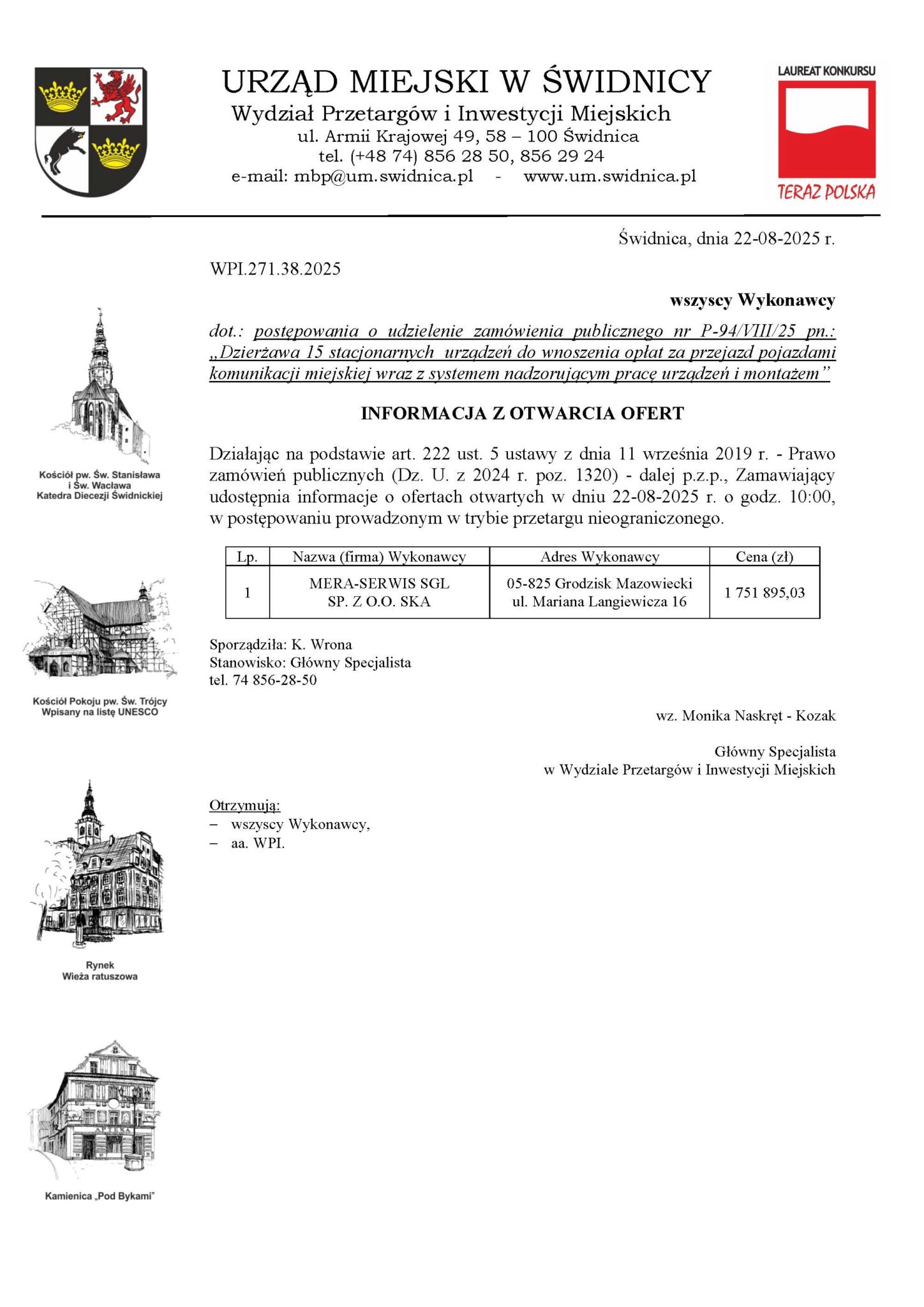 22 sierpnia 2025 r. w Świdnicy dokonano otwarcia ofert w postępowaniu przetargowym dotyczącym dzierżawy 15 stacjonarnych biletomatów.