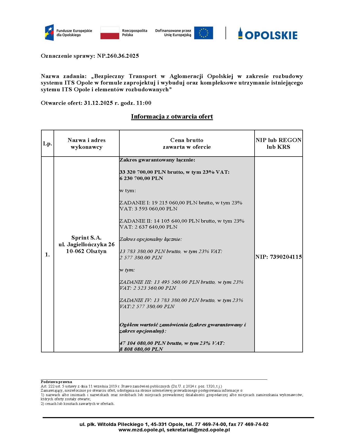 Otwarcie ofert nastąpiło 31 grudnia 2025 roku o godz. 11:00. Do postępowania wpłynęła jedna oferta, złożona przez Sprint S.A. z siedzibą w Olsztynie. Spółka zaproponowała realizację zakresu gwarantowanego za 33 320 700,00 PLN brutto, a zakresu opcjonalnego za 13 783 380,00 PLN brutto. Łączna wartość zamówienia, obejmująca zakres gwarantowany i opcjonalny, wynosi 47 104 080,00 PLN brutto, w tym 8 808 080,00 PLN VAT.