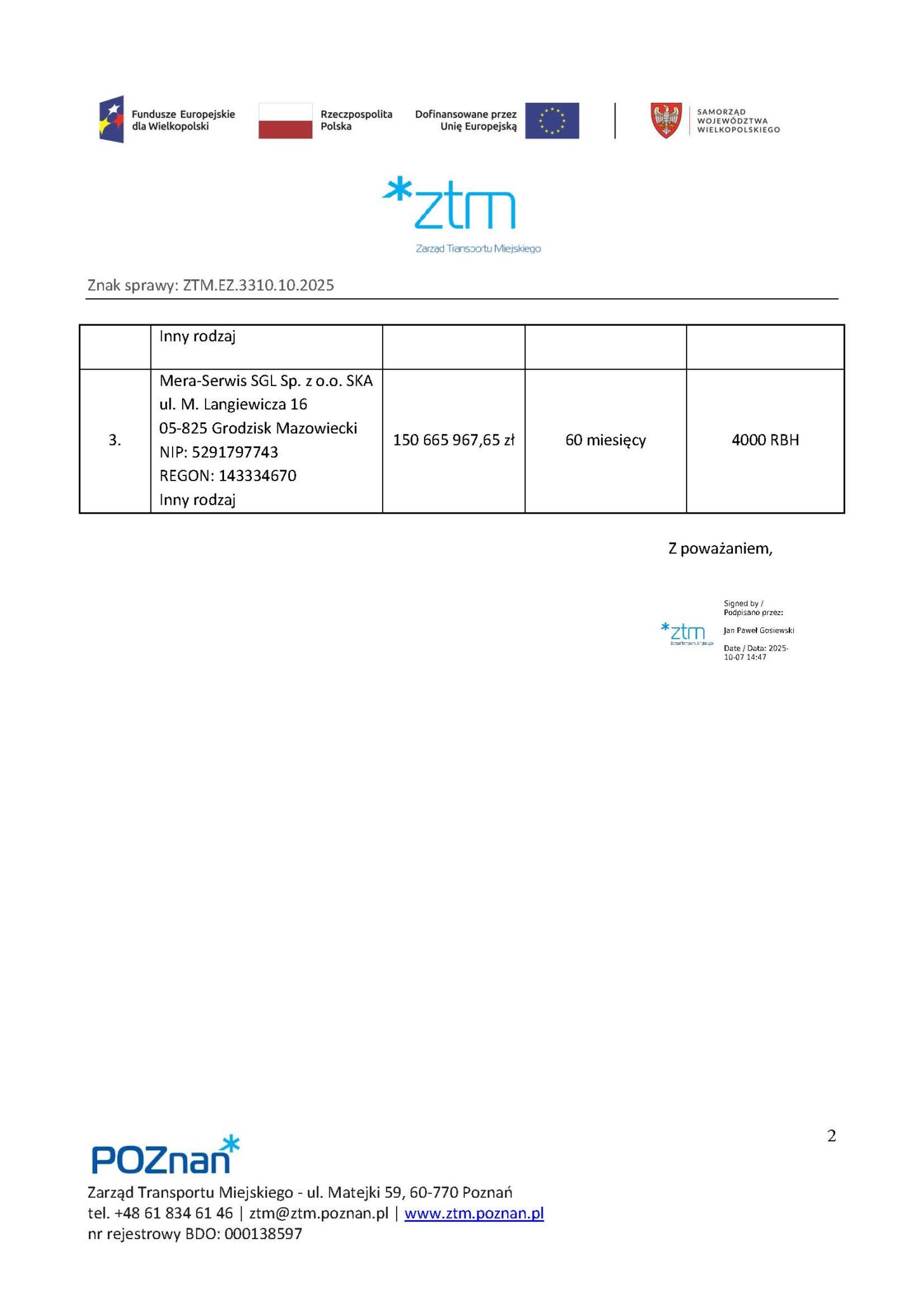 Trzecim oferentem jest Mera-Serwis SGL Sp. z o.o. SKA, jednak jej cena nie została ujawniona w informacji z otwarcia ofert.