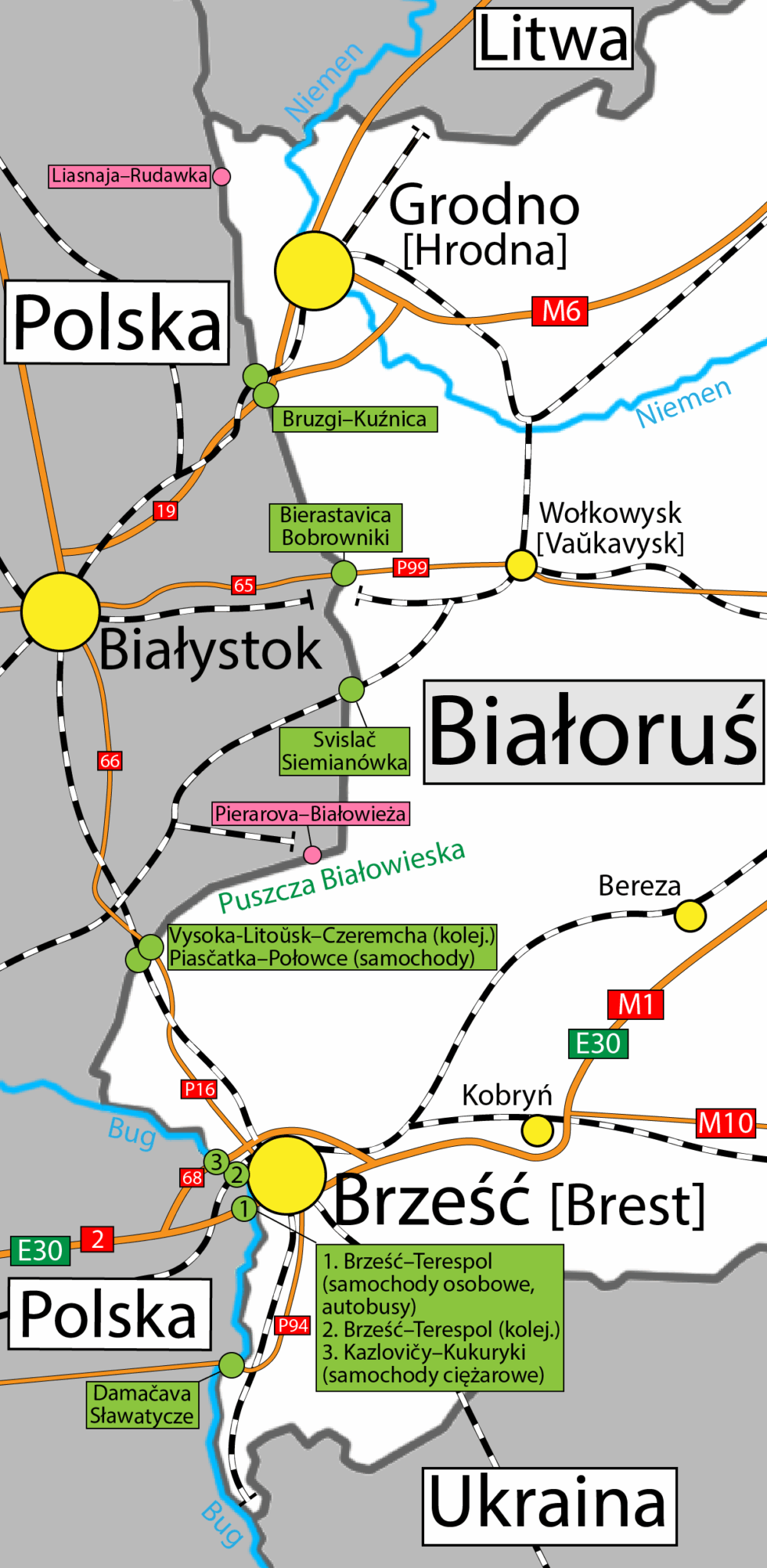 W ciągu dróg krajowych istnieje łącznie sześć przejść granicznych z Białorusią. Cztery z nich (na DK63 w Sławatyczach, DK66 w Połowcach, DK65 w Bobrownikach i DK19 w Kuźnicy) pozostają zamknięte. Przejście w Połowcach zamknięto jeszcze w pandemii COVID-19, przejście w Kuźnicy nie działa od listopada 2021 r. Zamknięto je, gdy wcześniej doszło tam do ataku ze strony białoruskiej z wykorzystaniem migrantów. Przejście w Bobrownikach zamknięto w lutym 2023 r., gdy białoruski sąd wydał wyrok na działacza Związku Polaków na Białorusi, dziennikarza Andrzeja Poczobuta. (PAP)