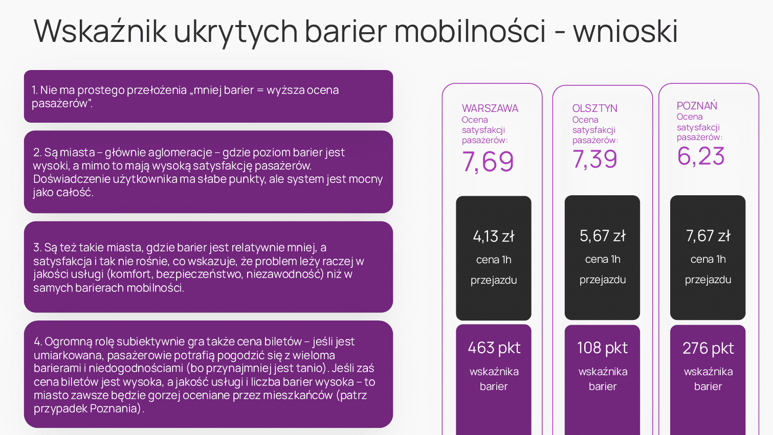 W ogólnej ocenie satysfakcji pasażerów najlepiej wypadła Warszawa z wynikiem 7,69/10, przed Olsztynem (7,39), Białymstokiem (7,28), Radomiem (7,22) i Kielcami (7,09). Pierwszą dziesiątkę uzupełniają Rzeszów (7,05), GZM (7,04), Kraków (6,83), Trójmiasto (6,83) oraz Szczecin (6,78). Na drugim końcu zestawienia znalazły się: Łódź (5,79), Poznań (6,23), Bydgoszcz (6,25), Lublin (6,39), Toruń (6,45), Wrocław (6,67), Szczecin (6,78), Kraków (6,83), Trójmiasto (6,83) i GZM (7,04). Trzeba jednak zaznaczyć, że raport obejmuje 16 głównych systemów, a różnice nie są tak duże.