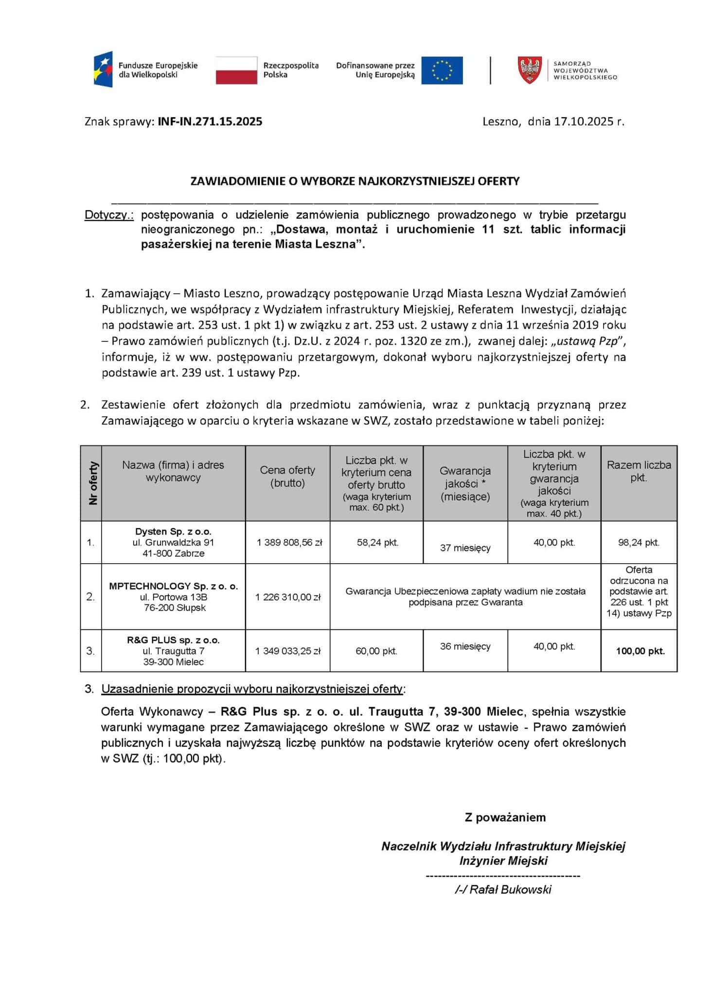 17 października 2025 roku Miasto Leszno poinformowało o wyborze najkorzystniejszej oferty w przetargu na dostawę, montaż i uruchomienie 11 cyfrowych tablic informacji pasażerskiej.