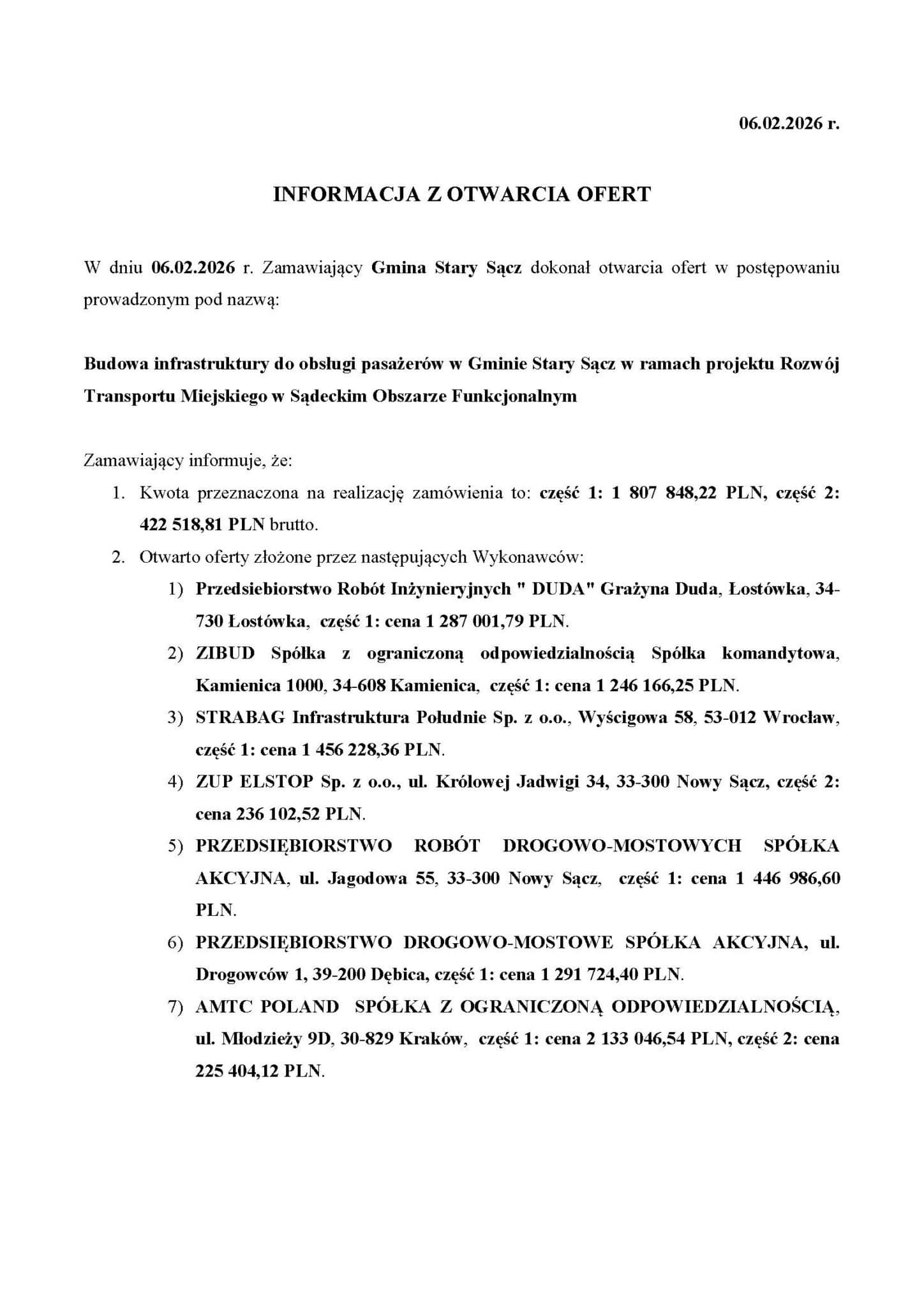 Otwarcie ofert nastąpiło 6 lutego 2026 roku. Zamawiający przeznaczył na realizację zamówienia 1 807 848,22 PLN dla części pierwszej oraz 422 518,81 PLN dla części drugiej.