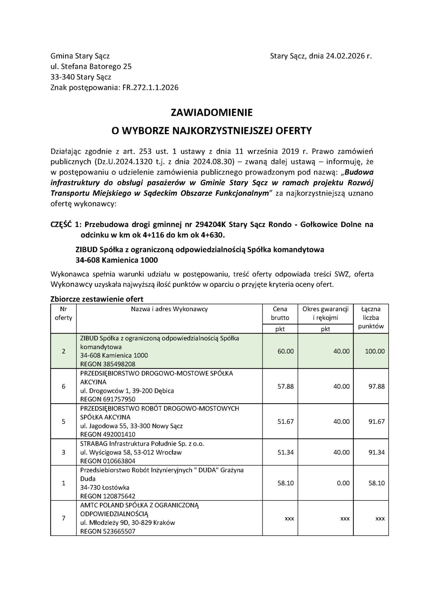 W części pierwszej wpłynęło sześć ofert, co pokazuje stosunkowo wysokie zainteresowanie rynku. Najniższą cenę zaproponowała Zibud spółka z ograniczoną odpowiedzialnością spółka komandytowa – 1 246 166,25 PLN, wyprzedzając m.in. Przedsiębiorstwo drogowo-mostowe spółka akcyjna (1 291 724,40 PLN) oraz Przedsiębiorstwo robót drogowo-mostowych spółka akcyjna (1 446 986,60 PLN). Kolejne oferty złożyły Strabag infrastruktura południe sp. z o.o. (1 456 228,36 PLN) oraz Przedsiębiorstwo robót inżynieryjnych „Duda” (1 287 001,79 PLN). Najdroższa była propozycja Amtc poland spółka z ograniczoną odpowiedzialnością – 2 133 046,54 PLN, która przekroczyła budżet zamawiającego. Ocena ofert opierała się na dwóch kryteriach: cena (60%) oraz gwarancja i rękojmia (40%). Najwyższą ocenę – 100 punktów – uzyskała oferta Zibud spółka z ograniczoną odpowiedzialnością spółka komandytowa, co przesądziło o jej wyborze.