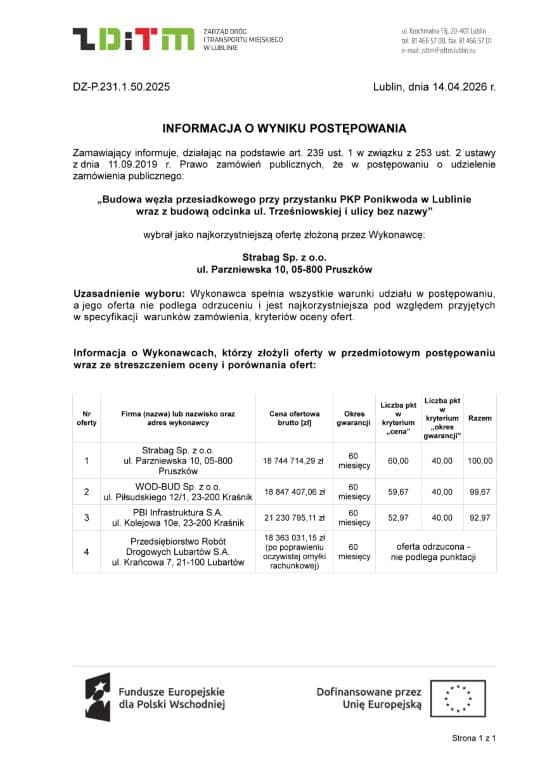 14 kwietnia 2026 roku Zarząd Dróg i Transportu Miejskiego w Lublinie rozstrzygnął przetarg na budowę węzła przesiadkowego przy PKP Ponikwoda.