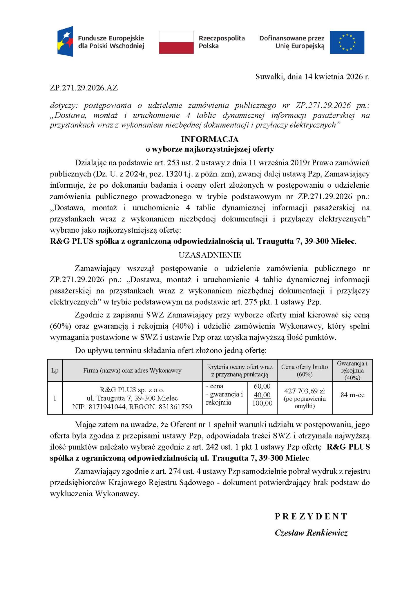 14 kwietnia 2026 roku Miasto Suwałki wybrało najkorzystniejszą ofertę w przetargu na system informacji pasażerskiej.