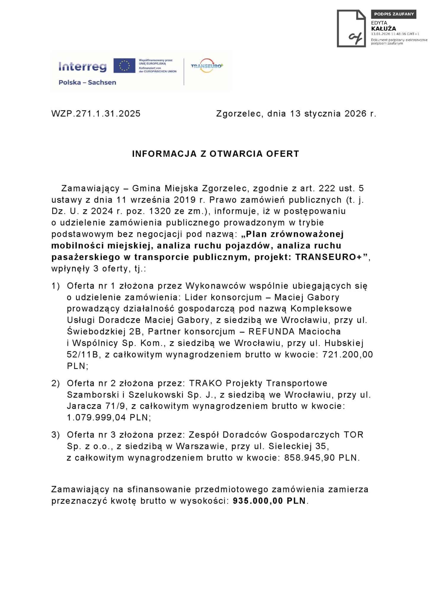 - Trako Projekty Transportowe Szamborski i Szelukowski Sp. J. – 1 079 999,04 PLN z VAT 23% (oferta odrzucona)