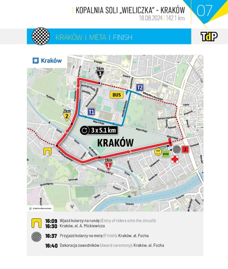 Finisz będzie miał miejsce na al. Focha przy Błoniach. Zakończenie etapu przewidziane jest około godz. 16.45. Także przy Błoniach nastąpi dekoracja najlepszych na trasie 81. Tour de Pologne.