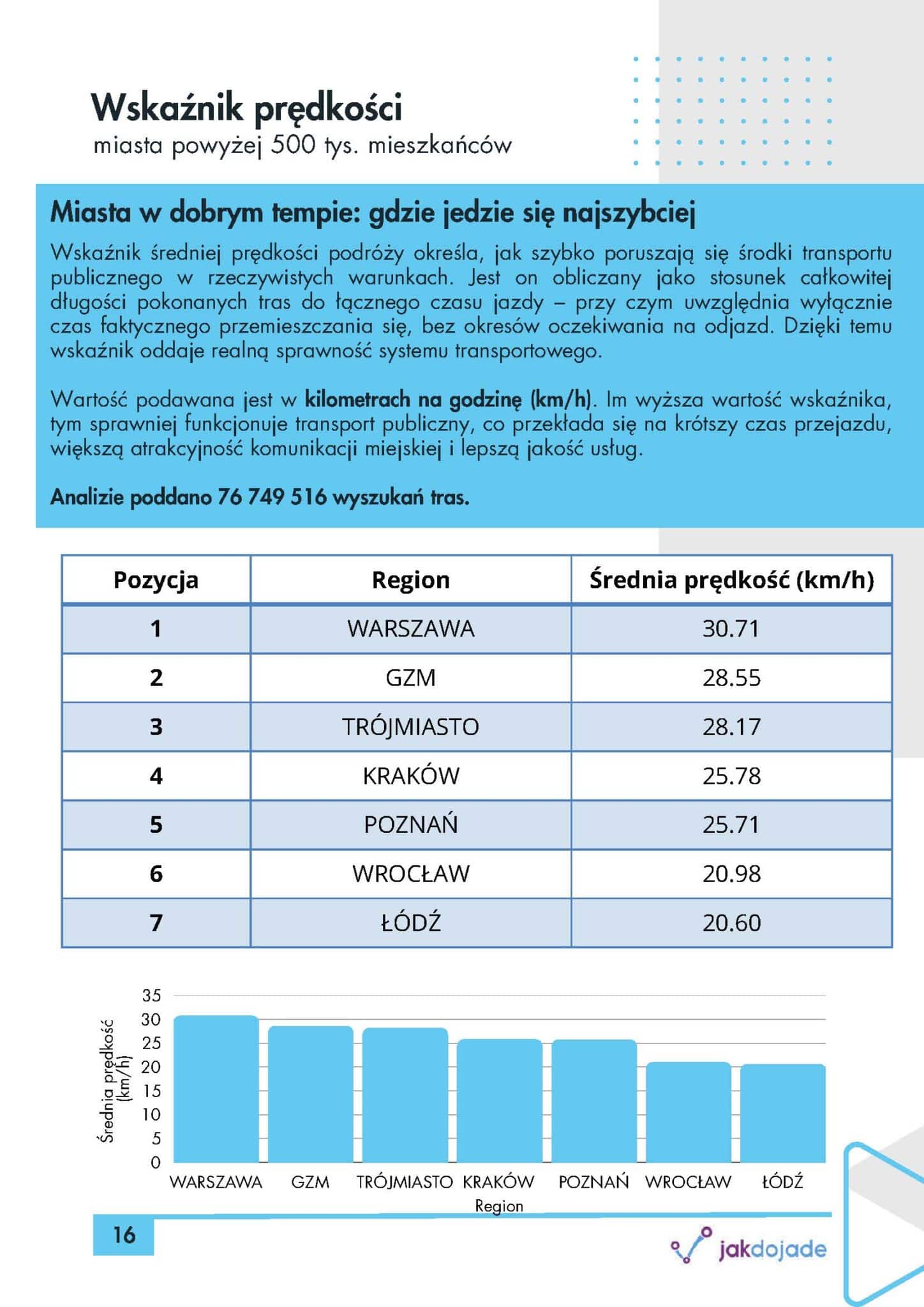 Raport analizuje transport publiczny przez pryzmat: wskaźnika punktualności, dystansu przy przesiadkach, oczekiwania, prędkości, częstotliwości oraz liczby przesiadek. Każdy z nich dotyczy innego elementu podróży pasażera – od tego, czy autobus przyjeżdża na czas, po to, ile trzeba czekać i jak daleko przejść między peronami czy przystankami.