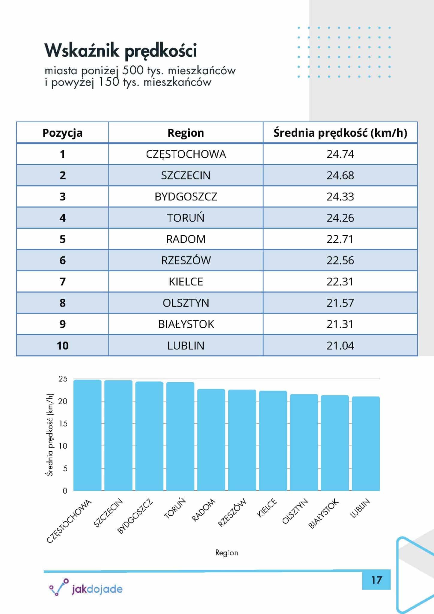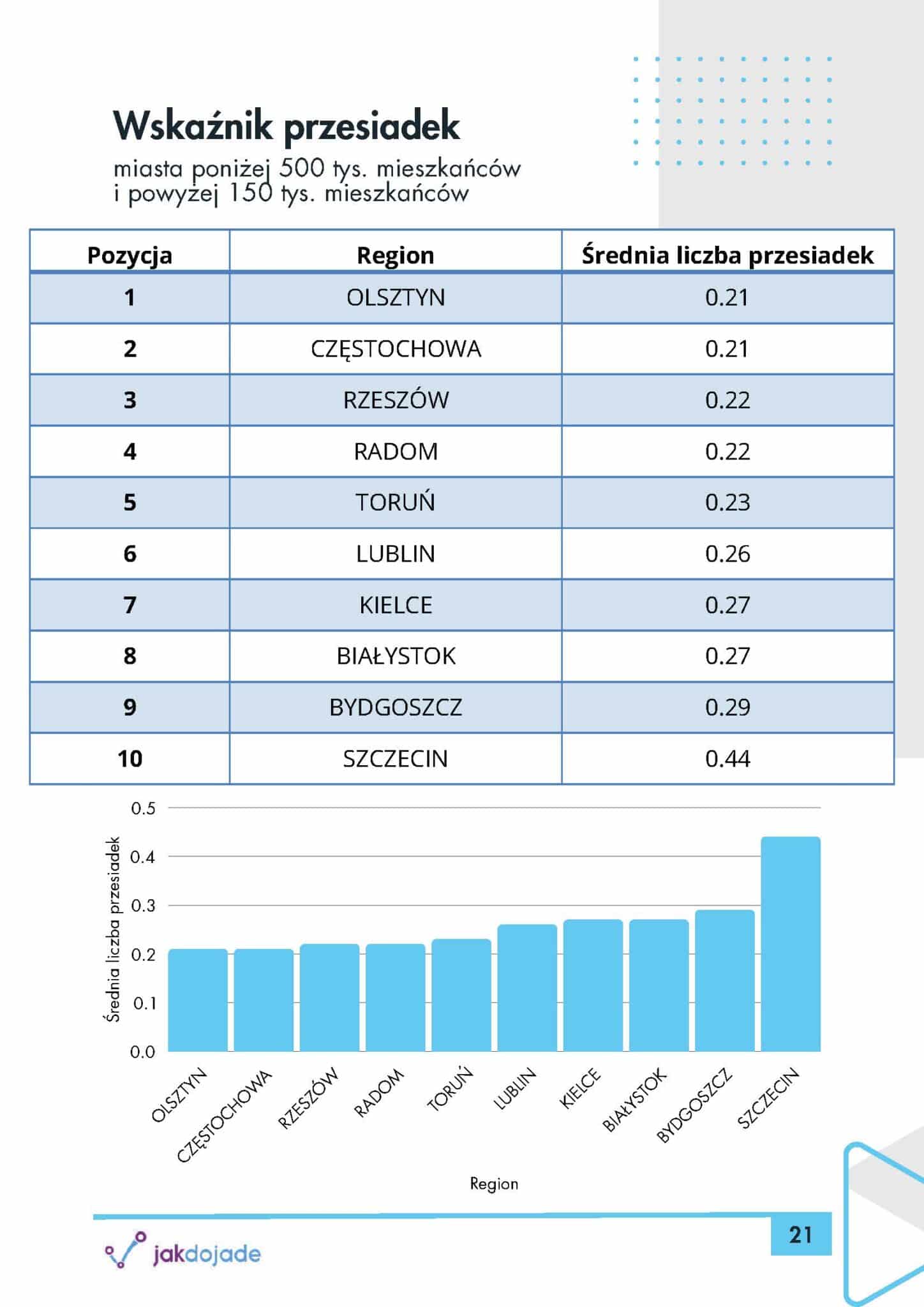 Rzeszów wyróżnia się korzystnym wskaźnikiem prędkości oraz relatywnie dobrą częstotliwością, co jest efektem inwestycji w buspasy i systemy ITS. Olsztyn, dzięki integracji autobusu i tramwaju, poprawił wskaźnik prędkości oraz ograniczył liczbę przesiadek w kluczowych relacjach.