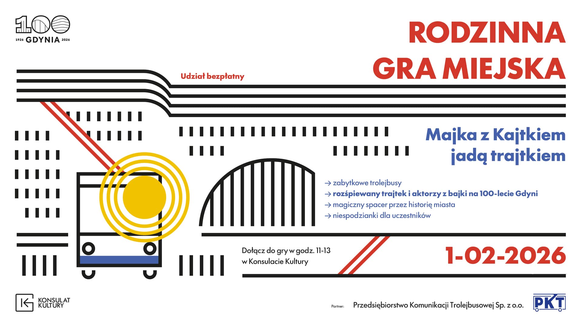 Już 1 lutego centrum Gdyni zamieni się w przestrzeń gry miejskiej inspirowanej bajką „Majka z Kajtkiem jadą trajtkiem”, przygotowaną z okazji 100-lecia miasta przez Konsulat Kultury. Kluczowym elementem wydarzenia będą cztery zabytkowe trolejbusy, które staną na trasie gry jako pełnoprawne stacje fabularne i historyczne.