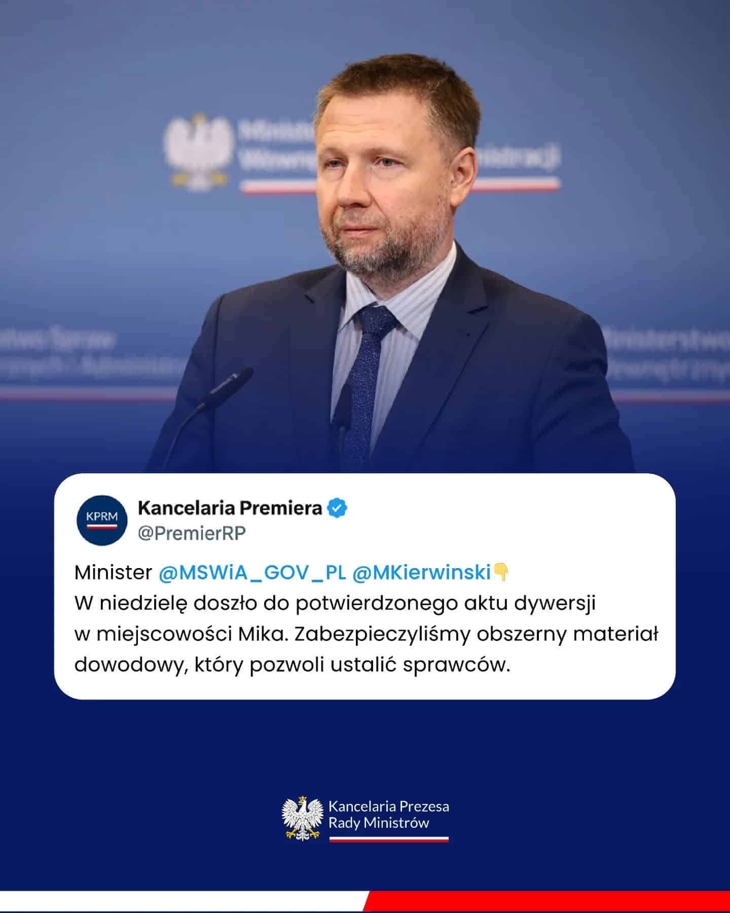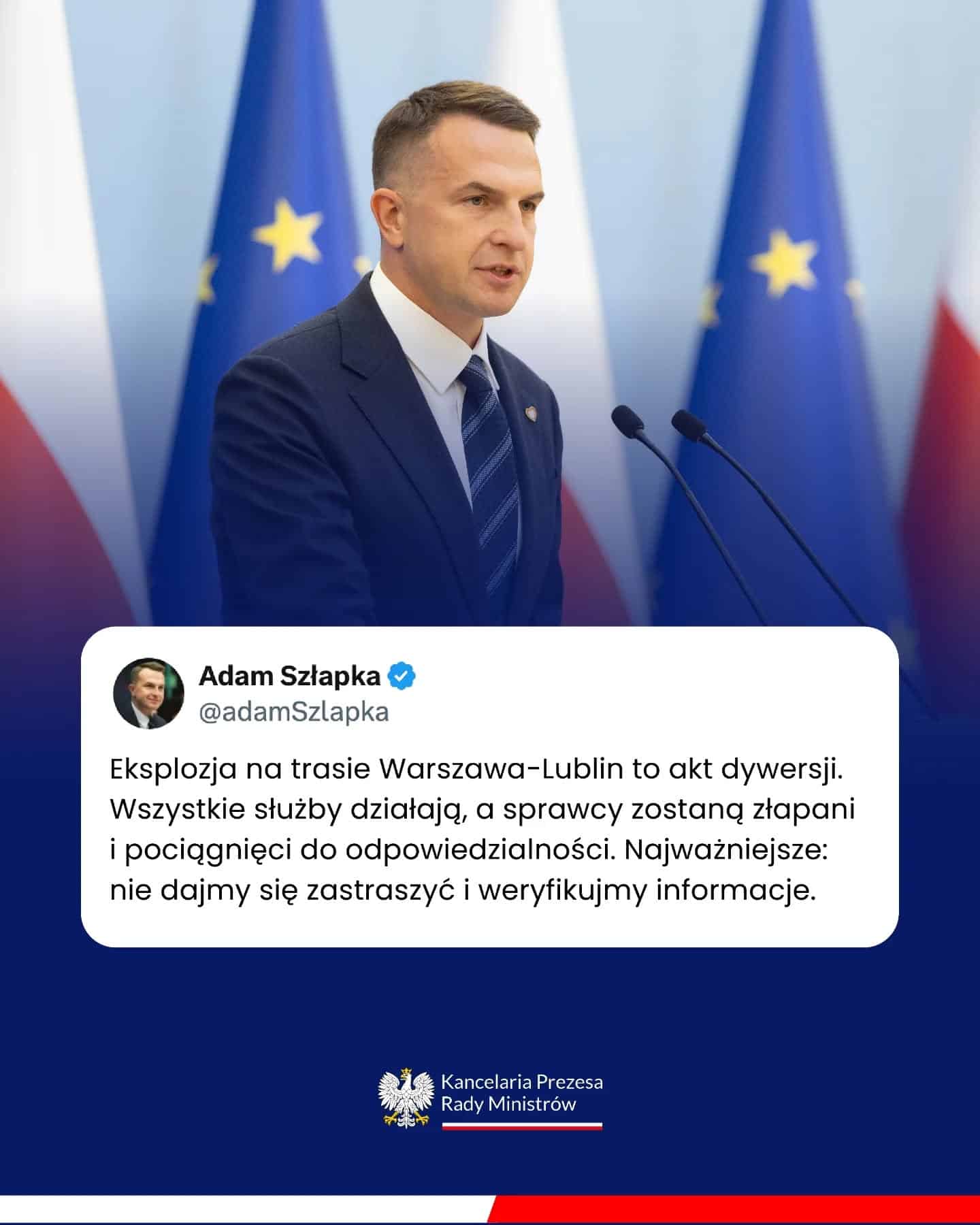 We wpisie w serwisie X premier napisał, że wysadzenie toru kolejowego na trasie Warszawa – Lublin to bezprecedensowy akt dywersji wymierzony w bezpieczeństwo państwa polskiego i jego obywateli.