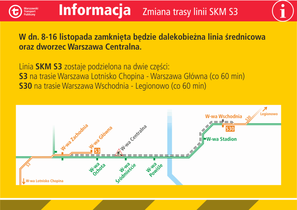 „Linia SKM S3 zostanie podzielona w tym czasie na dwie części. Z Lotniska Chopina do Warszawy Głównej pociągi będą jeździły jako S3, a między Warszawą Wschodnią i Legionowem jako S30. Kursy będą co ok. 60 minut. Niewielkie zmiany w rozkładach jazdy będą dla linii S1, S2, S4 i S40” - poinformował rzecznik Zarządu Transportu Miejskiego Tomasz Kunert.
