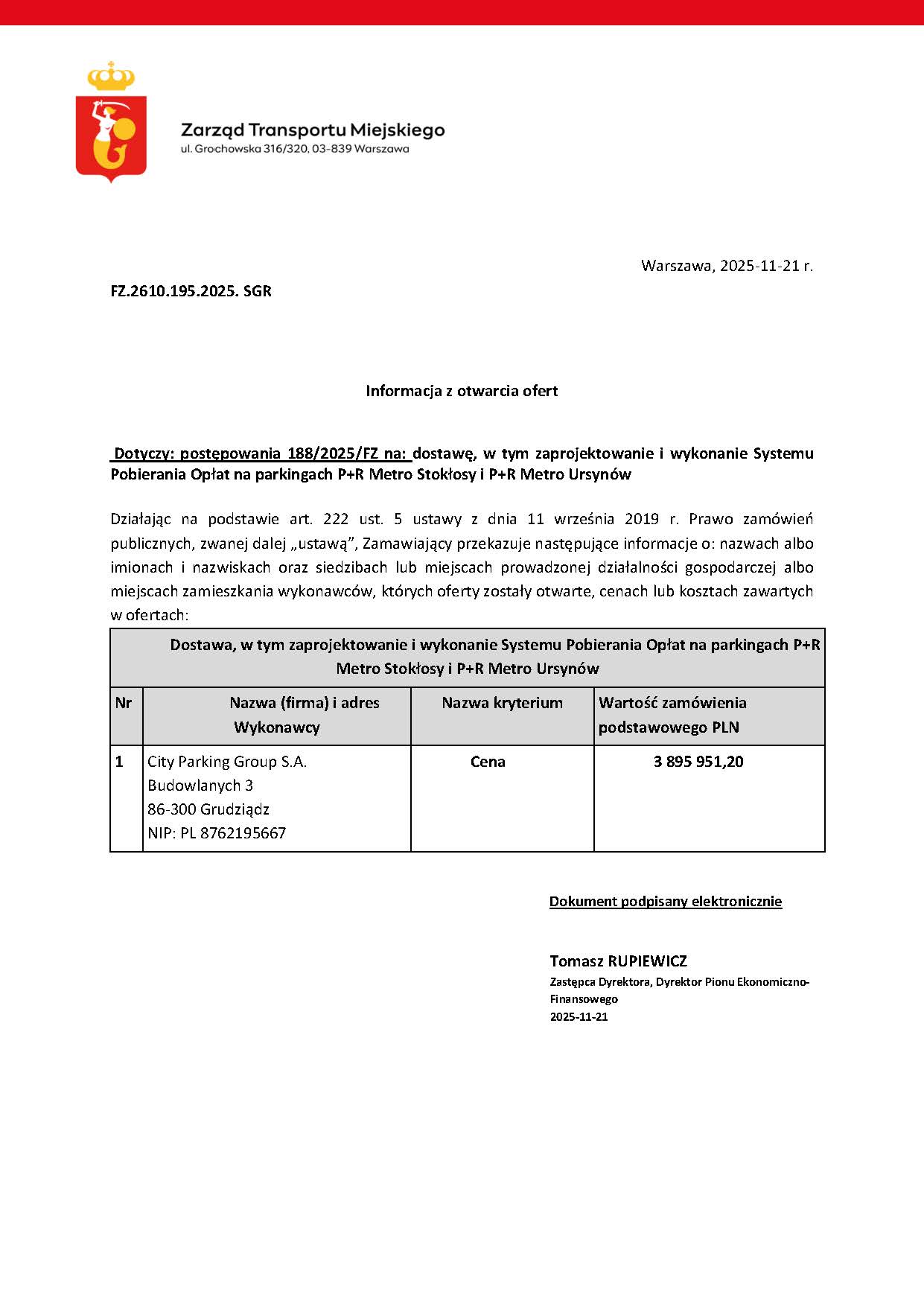 Jedyną ofertę złożyła City Parking Group S.A. z ceną 3 895 951,20 PLN brutto, co przy podatku VAT 23 procent daje 3 168 249,76 PLN netto. Z kolei kwota przewidziana na realizację zamówienia wynosi 3 316 910,10 PLN brutto, czyli około 2 697 500,08 PLN netto.