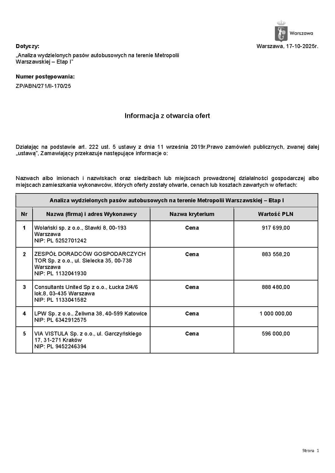 Wpłynęło pięć ofert. Najtańsza pochodziła od VIA VISTULA Sp. z o.o. z Krakowa – 596.000 PLN brutto, co odpowiada 484.552 PLN netto. ZESPÓŁ DORADCÓW GOSPODARCZYCH TOR zaoferował 883.558,20 PLN brutto / 718.341 PLN netto, a Consultants United Sp. z o.o. – 888.480 PLN brutto / 722.325 PLN netto. Kolejna oferta – Wolański sp. z o.o. – wynosiła 917.699 PLN brutto / 746.502 PLN netto, a najwyższa, złożona przez LPW Sp. z o.o., opiewała na 1.000.000 PLN brutto / 813.008 PLN netto. Najkorzystniejsza oferta – VIA VISTULA – daje więc cenę jednostkową netto za jeden projekt analityczny (przyjęty jako „autobus” dla porównania kosztów inwestycyjnych) na poziomie 484.552 PLN netto.