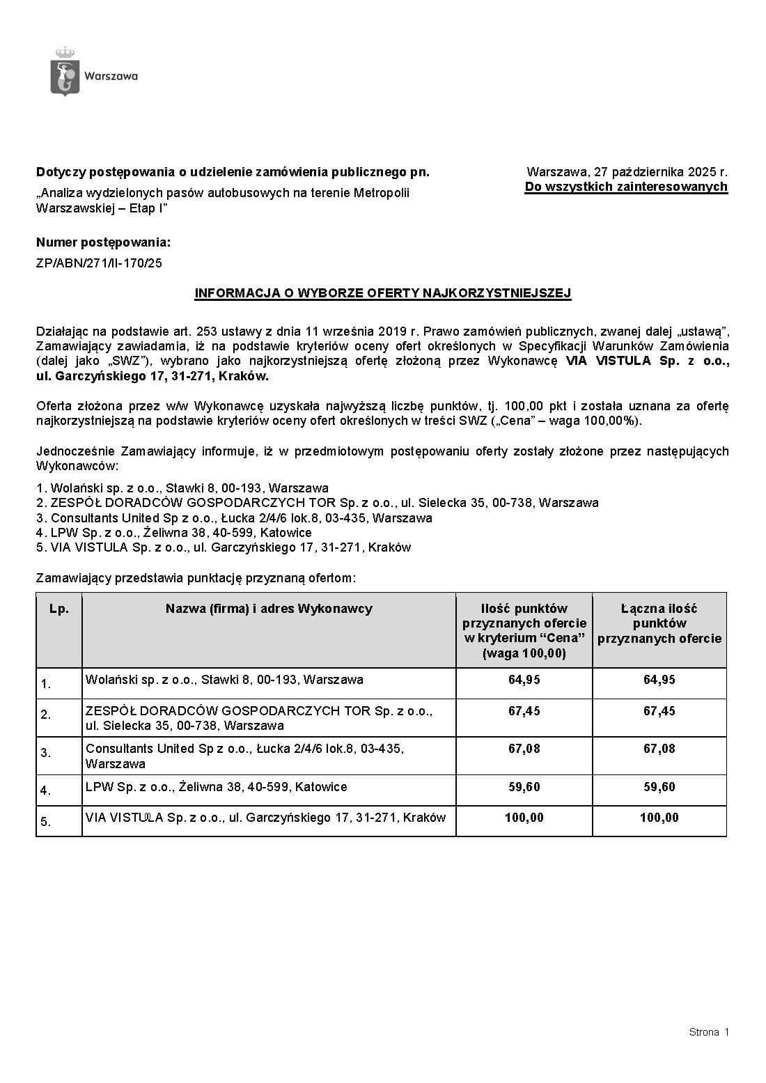 Ostatecznie wybrano VIA VISTULA Sp. z o.o., której oferta uzyskała 100 punktów i została uznana za najkorzystniejszą.