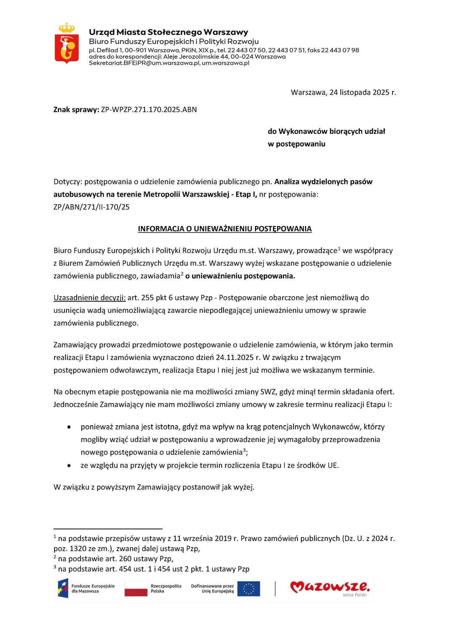 24 listopada 2025 r. Miasto Stołeczne Warszawa oficjalnie unieważniło postępowanie dotyczące realizacji analiz transportowych w ramach „Planu zrównoważonej mobilności miejskiej dla metropolii warszawskiej (SUMP)”.