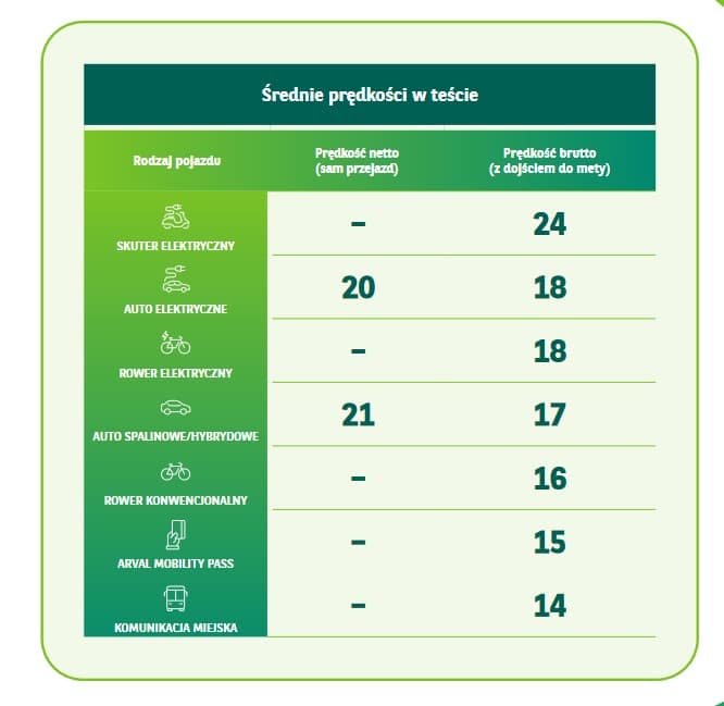 Najwyższą średnią prędkość (24 km/h) osiągnęły skutery elektryczne, które są idealnym rozwiązaniem w gęstym ruchu miejskim, gdzie często wygrywają z samochodami. Ich zaletą jest także brak problemów z parkowaniem oraz niski koszt eksploatacji, co czyni je atrakcyjnym wyborem dla osób poruszających się po mieście.