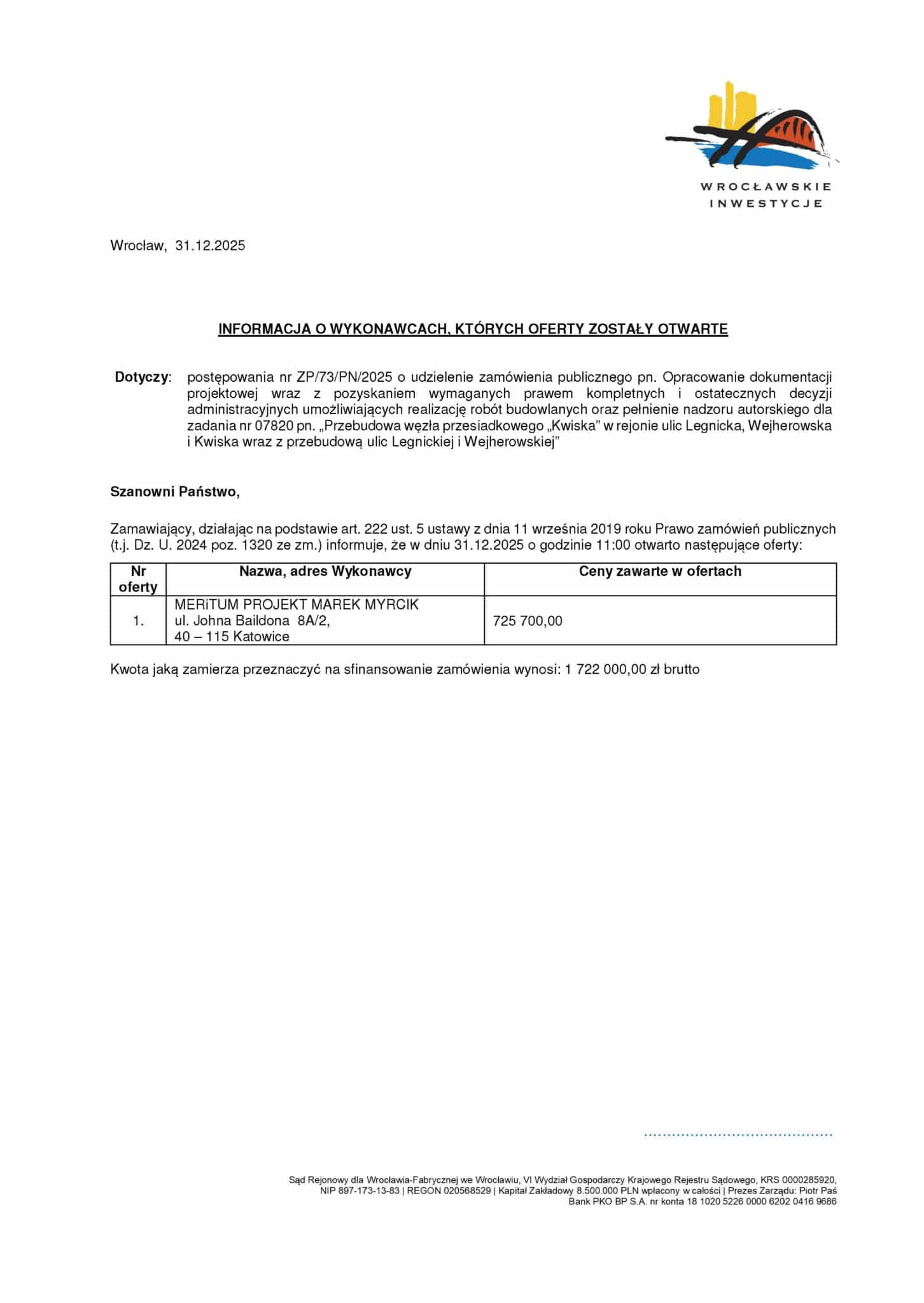 Na sfinansowanie zamówienia miasto przeznaczyło 1 722 000,00 zł brutto. Podczas otwarcia ofert, które odbyło się 31 grudnia 2025 r., ujawniono pierwszą propozycję cenową. Najniższą i jedyną ofertę w tym momencie złożyła firma MERiTUM PROJEKT Marek Myrcik z Katowic, proponując realizację zamówienia za 725 700,00 zł brutto.