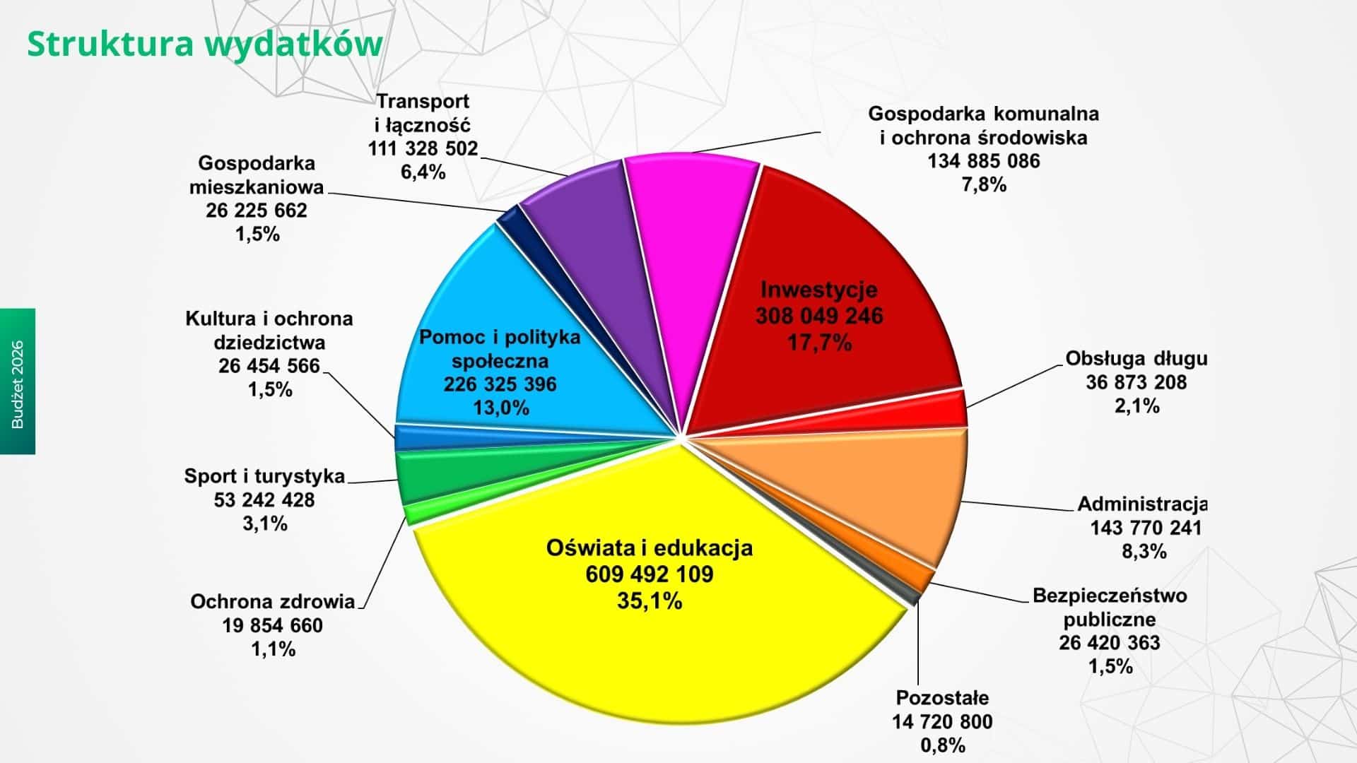 Po stronie wydatków największą pozycję stanowi oświata i edukacja z kwotą 628,4 mln zł, czyli 36,2 proc. wszystkich wydatków. Na pomoc społeczną i politykę rodzinną zaplanowano 232,2 mln zł, a na administrację publiczną 162,3 mln zł. Kultura, sport i turystyka pochłoną 115,7 mln zł, w tym 36 mln zł na inwestycje.