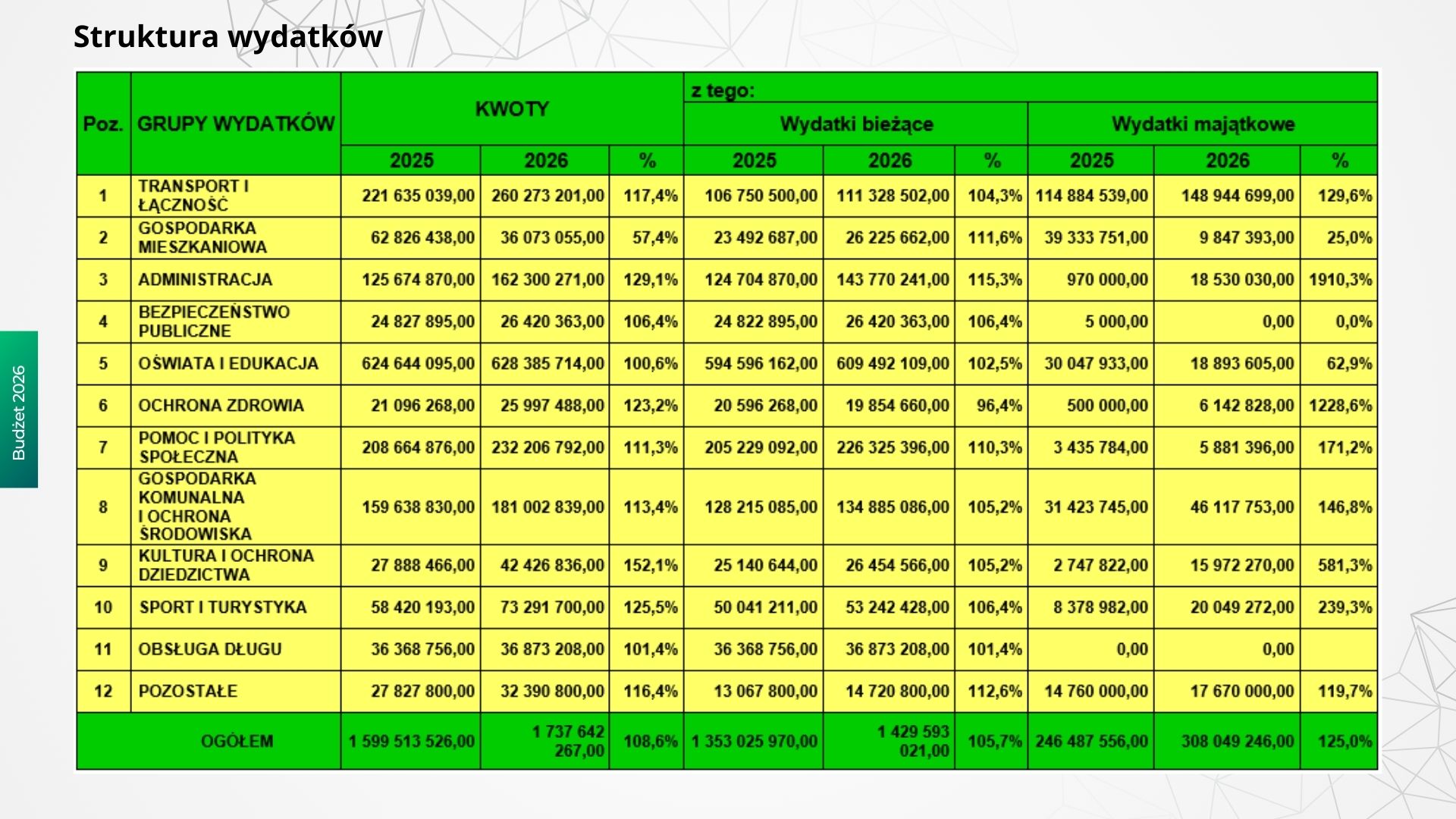 - Które obszary wydatków dominują w strukturze budżetu?