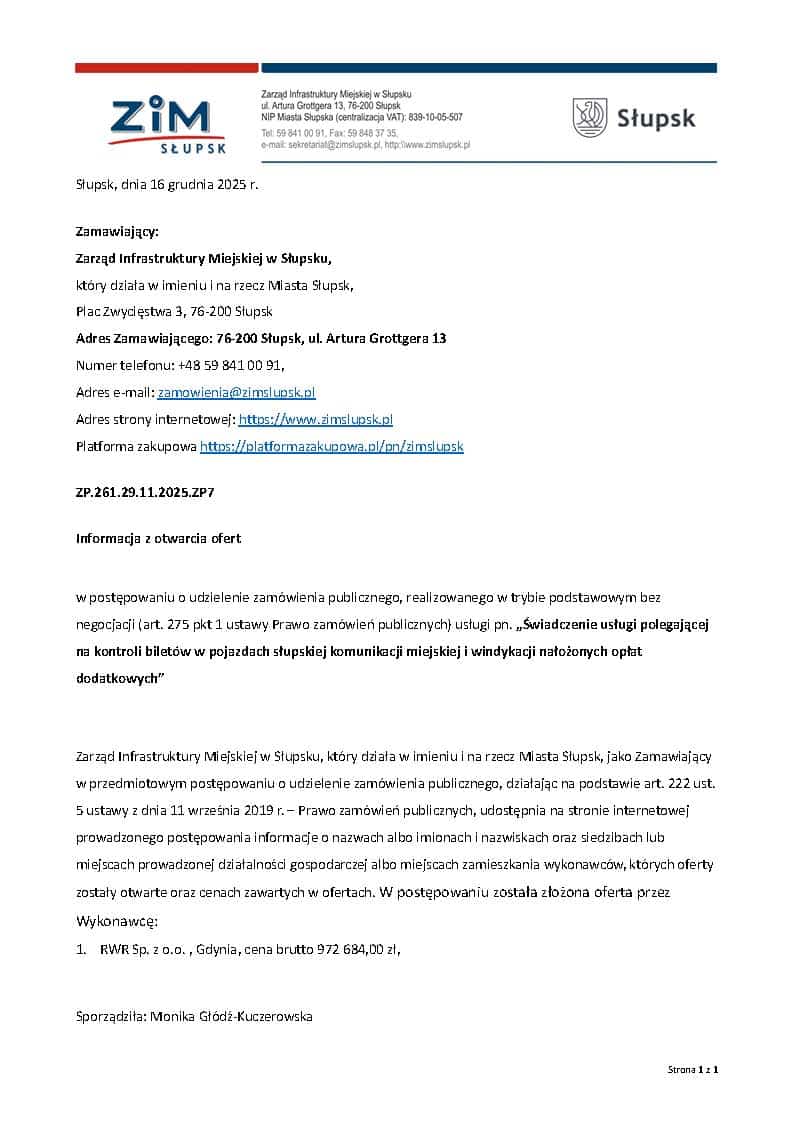 16 grudnia 2025 r. Zarząd Infrastruktury Miejskiej w Słupsku dokonał otwarcia ofert w postępowaniu na kompleksową kontrolę biletów w transporcie publicznym.
