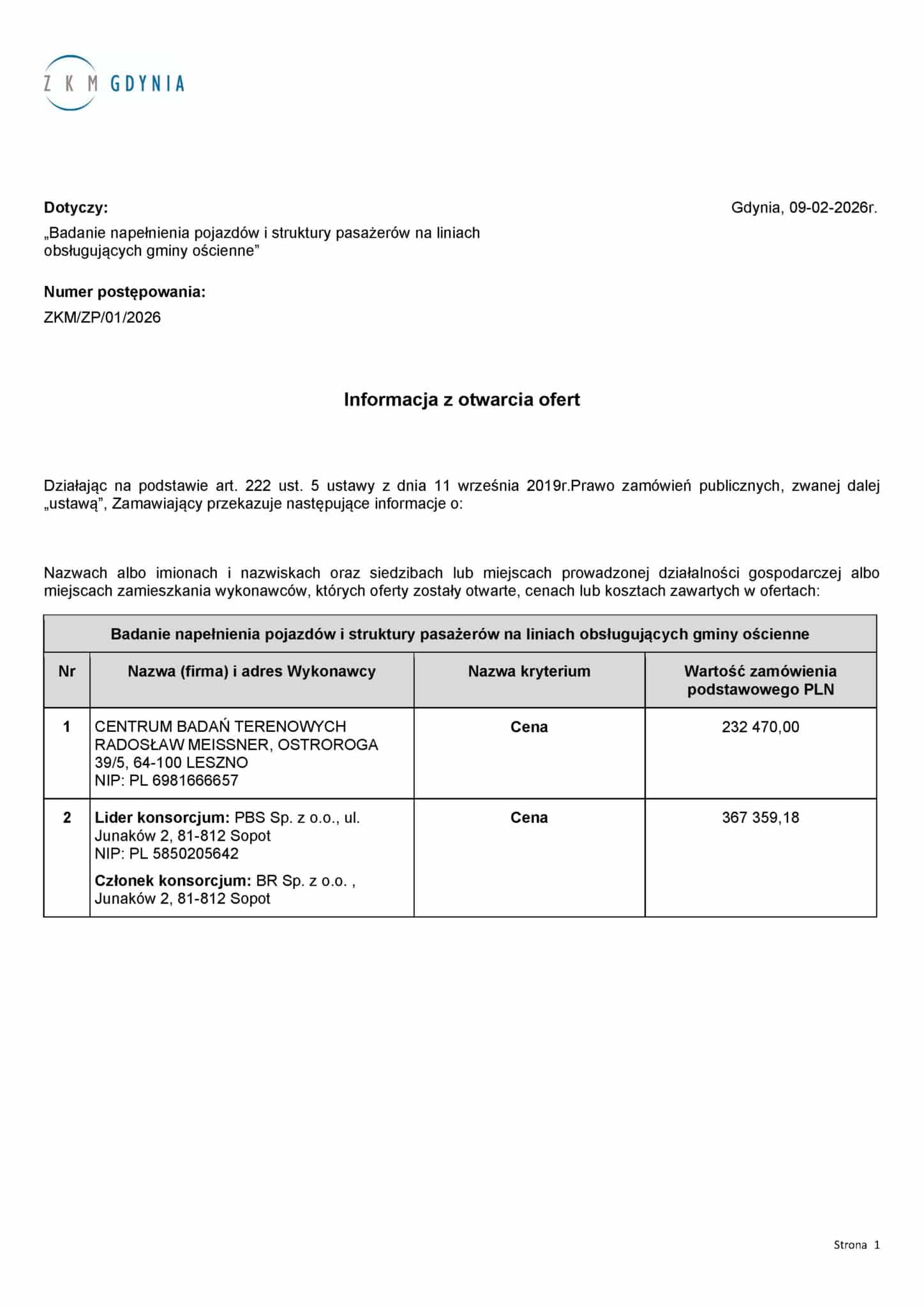 9 lutego 2026 roku w Gdyni miało miejsce otwarcia ofert w postępowaniu dotyczącym badań napełnienia pojazdów oraz struktury pasażerów w transporcie publicznym.