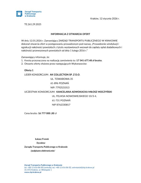 Przedmiotem zamówienia Zarządu Transportu Publicznego w Krakowie było świadczenie przez 36 miesięcy, począwszy od 1 kwietnia 2026 roku, kompleksowej usługi windykacji i egzekucji należności powstałych w krakowskiej komunikacji miejskiej.