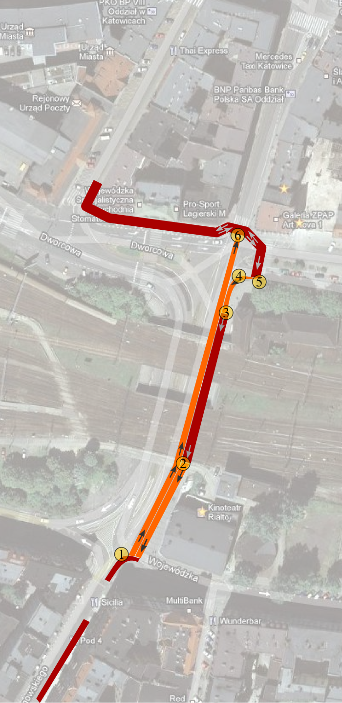 ’Przesyłam do zaopiniowania propozycję poprawienia przejazdu rowerem w nowo wybudowanej drodze rowerowej pod wiaduktem nad ulicą Kochanowskiego, koło kinoteatru Rialto w Katowicach. Istniejące elementy dróg rowerowych zaznaczyłem na czerwono. Proponowane zmiany –na pomarańczowo.