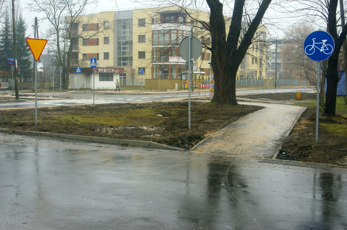 Na przecięciu z ulicą Krakowską i zakończeniu całego ciągu poczyniono już przygotowania pod wyznaczenie przejazdu dla rowerzystów – przesunięto słupek sygnalizatora tak, aby móc zmieścić przejazd obok (po południowej stronie) przejścia dla pieszych |