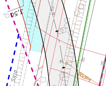 Porównując możliwe natężenie ruchu na ciągu pieszo-rowerowym oraz ilość pojazdów wjeżdżających na posesję (który to wjazd obecnie będzie wjazdem ślepym) łatwo zauważyć, że tego typu sytuacja winna nieść uprzywilejowanie dla rowerzystów i pieszych. Zatem sugerujemy, aby nawierzchnia oraz niweleta drogi ciągu pieszo-rowerowego była ciągła, a droga wjazdowa nie. Niebieską linią na rys. 6 sugerujemy krawężnik niewystający ponad wys. nawierzchni, który ma być czytelną informacją o przebiegach obu dróg. Odstęp między jezdnią, a ciągiem pieszo-rowerowym wystarczy by zróżnicować wysokość między nimi.