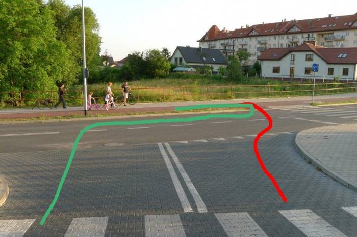 Kolorem czerwonym zaznaczono jak 'wjedzie’ rowerzysta na drogę dla rowerów, a na zielono jak z niej 'zjedzie’.