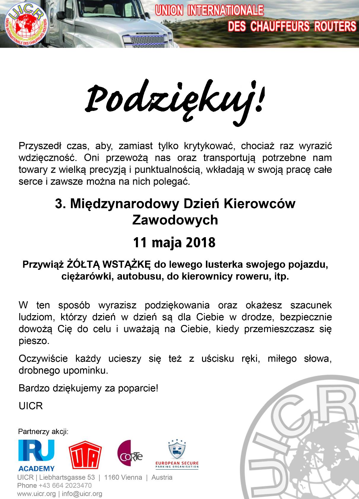 Dzięki staraniom największych światowych organizacji UICR (kierowców) i IRU (przewoźników) od trzech lat kierowcy zawodowi całego mająswoje święto. Jest nim zawsze 2. piątek maja. W tym roku to 11.05.br. z tejokazji odbędą się centralne obchody przy „starej dwójce” czyli obecnie DK 92.Powyżej program wydarzeń.