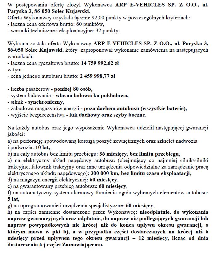 6 września producent z Solca Kujawskiego położył ofertę, która opiewa na 14.759.992,62 PLN brutto / 11.999.993 PLN netto, co daje jednostkową cenę za autobus Pilea 8,6 E na poziomie 1.999.998,80 PLN netto. Z kolei szacunkowy budżet zamawiającego wynosi 14.760.000 PLN brutto / 12.000.0000 PLN netto, co daje równo po 2.000.000 PLN netto za jeden elektrobus klasy MIDI. Tym samym ARP idealnie wpasował się w sumę przeinaczoną na realizację zamówienia i już może chłodzić szampana na okoliczność wygranej. To także największy kontrakt w historii spółki! Czekamy oczywiście jeszcze na umowę i będzie można rozpocząć wielkie świętowanie w Solcu Kujawskim.