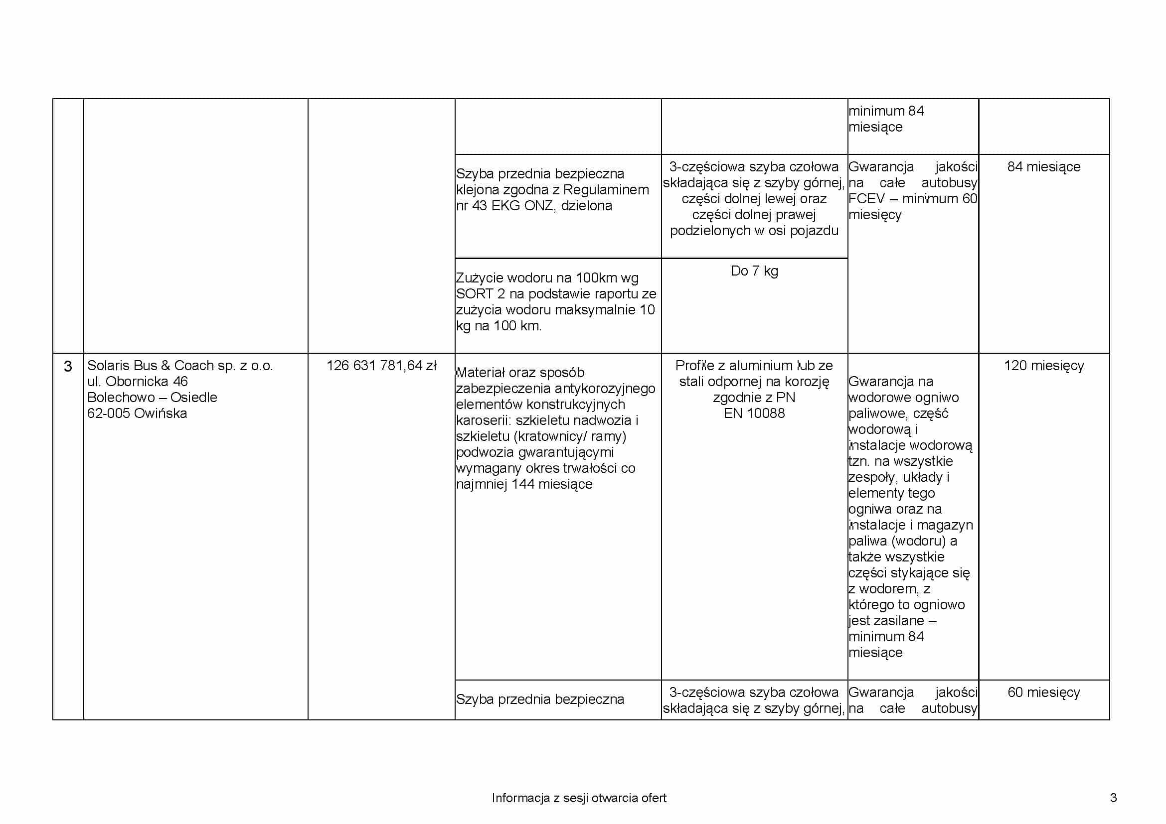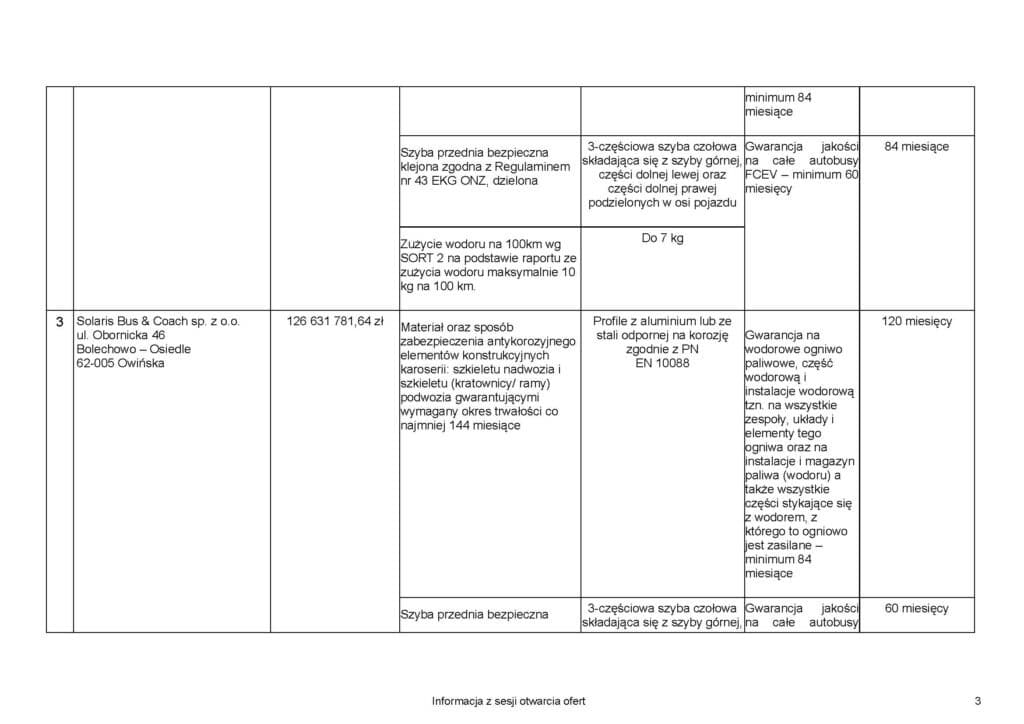 - Gwarancja jakości na całe autobusy FCEV – minimum 60 miesięcy: 84 miesiące